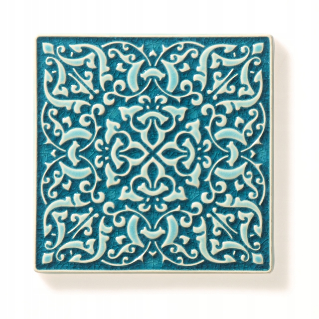 Настінна керамічна плитка зі злегка опуклим складним орнаментом. Виготовлена вручну зі світлої глини, покрита блискучою бірюзовою глазур’ю, що доречно підкреслює арабесковий малюнок поверхні. Двічі обпалений при високій температурі. Стійкість до води, стирання, високих і низьких температур. Монтаж як стандартна плитка. Рекомендую.