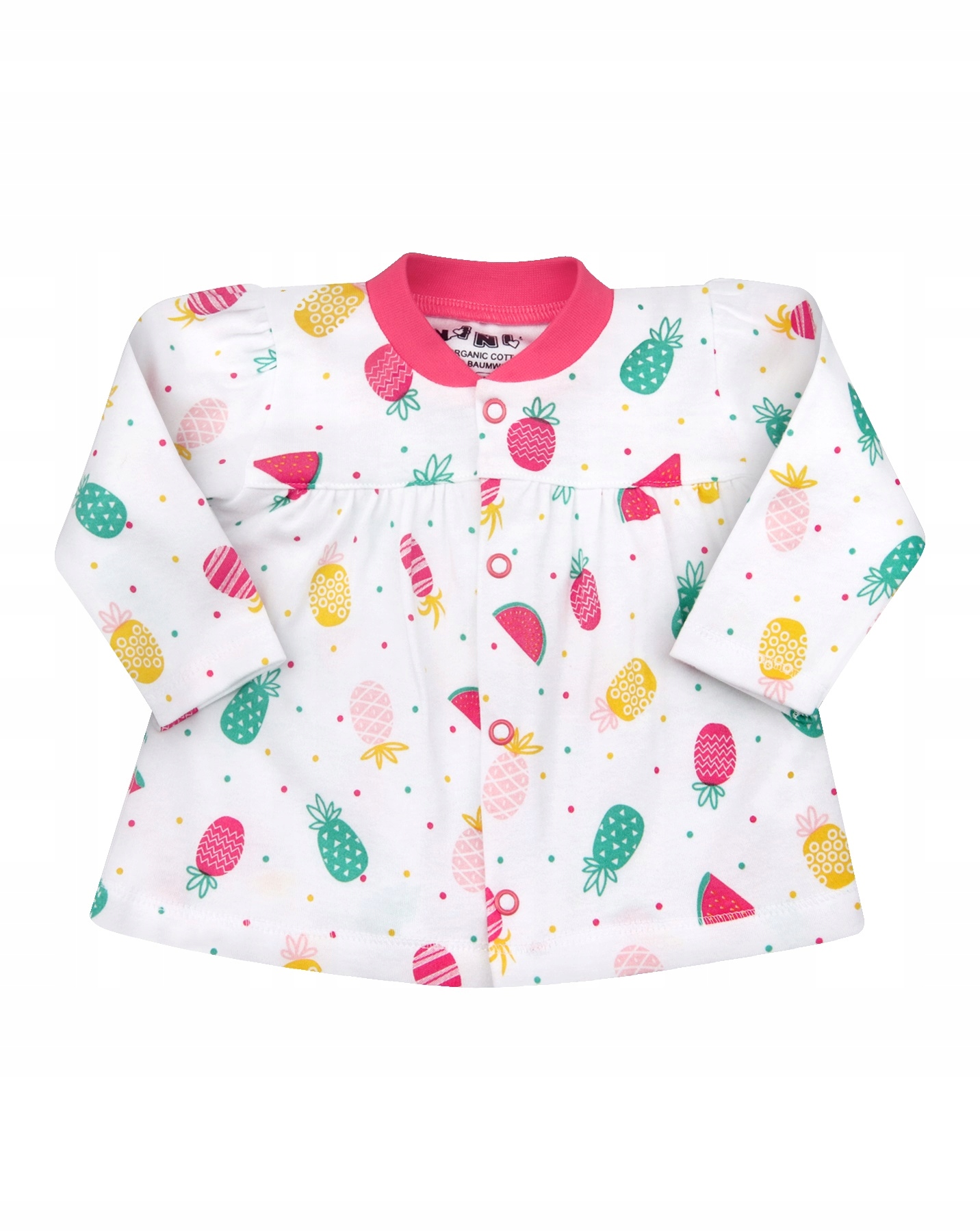 Кафтанік Фут Кафтанік з довгим рукавом, застібається по всій довжині. Гарний одяг для дівчаток білого кольору з рожевими акцентами та фруктовим малюнком. Боді ідеально підходить для перших днів життя вашої дитини, оскільки його легко знімати та одягати. Ідеальний одяг для лежання з високоякісної органічної бавовни. Органічна бавовна робить одяг надзвичайно ніжним, приємним на дотик і безпечним. Застібка по всій довжині одягу призначена для полегшення частого догляду та переодягання новонародженого.