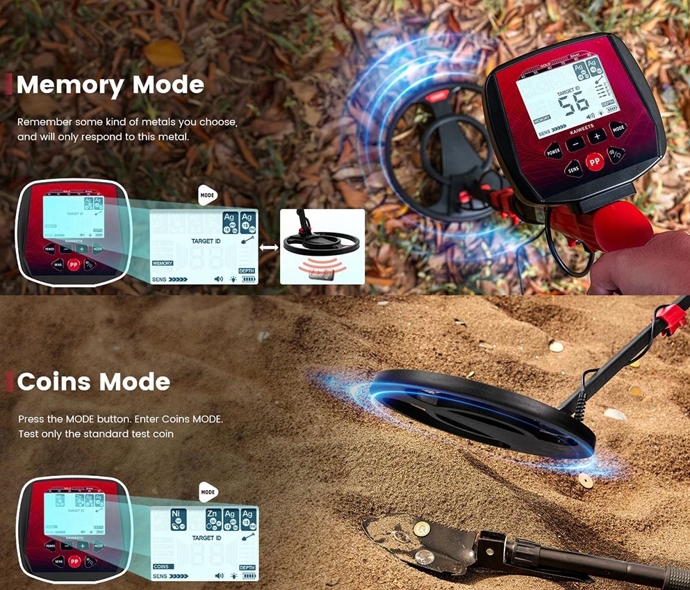 Інтуїтивно зрозумілий РК-дисплей Зручний інтерфейс, спеціально розроблений для початківців. Функція підсвічування полегшує пошук скарбів в умовах слабкого освітлення або вночі. Робота з кнопками, 3 режими відображення для легкої ідентифікації типу виявлених металів, цифровий дисплей, зображення та звук. Зручно отримати тип металевої цілі, глибину, розвідку, рівень чутливості та режим роботи, що дозволяє більш ефективно виявити.