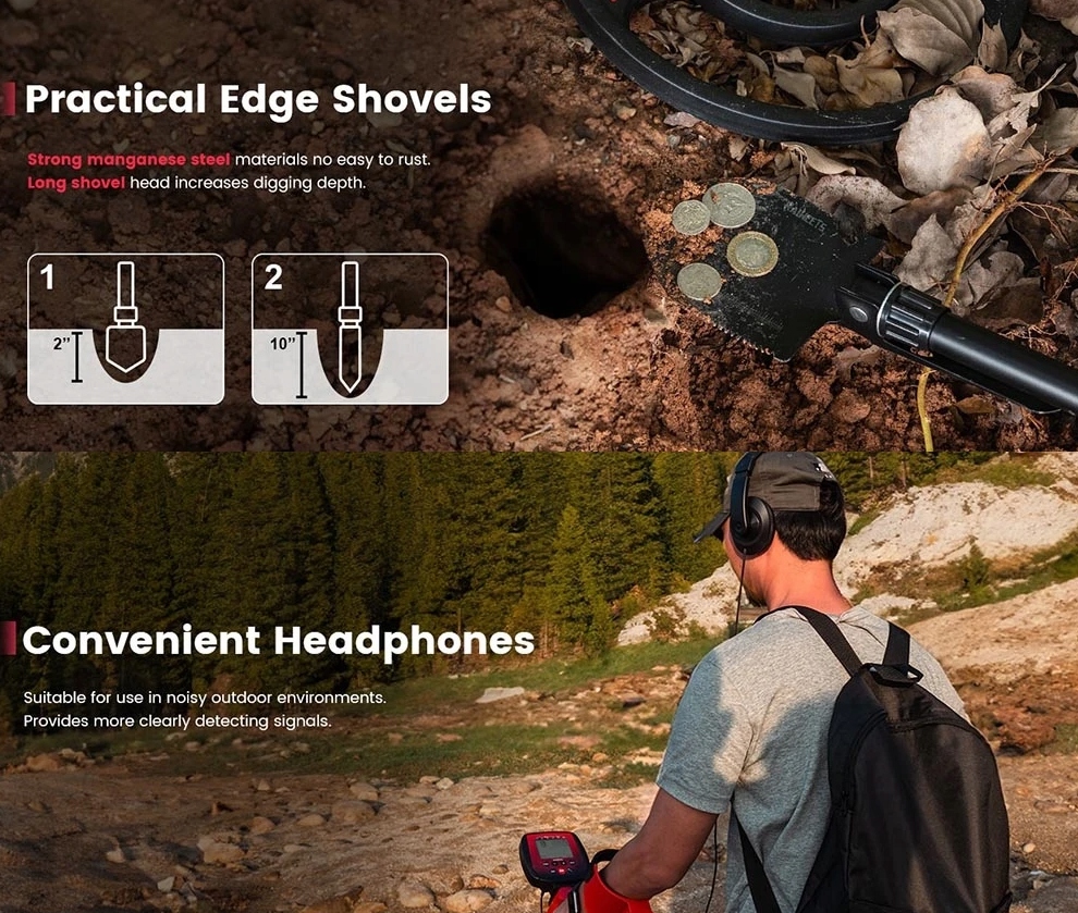 Високоточний металошукач Металошукач оснащений пристроєм балансування місцевості, який може усунути вплив «реакції мінералізації». Стабільний прийом сигналів виявлення може допомогти знайти скарби в найкоротші терміни. Металошукачі мають водонепроникну 10-дюймову пошукову котушку (блок керування не є водонепроникним) і можуть виявляти на глибині до 11,8 дюйма, тому ви можете сканувати більші та глибші області.