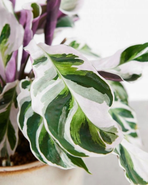 Калатея характеризується дуже декоративним листям, тому ми любимо прикрашати нею наш інтер'єр . Цей вид має щільну форму, листя кріпляться на довгих черешках. Листові пластинки мальовничо забарвлені. Верхня сторона вкрита білими і зеленими плямами неправильної форми, ніби вони намальовані вручну. Нижня сторона листя контрастно-фіолетова. Вся рослина виглядає надзвичайно елегантно і легко.
