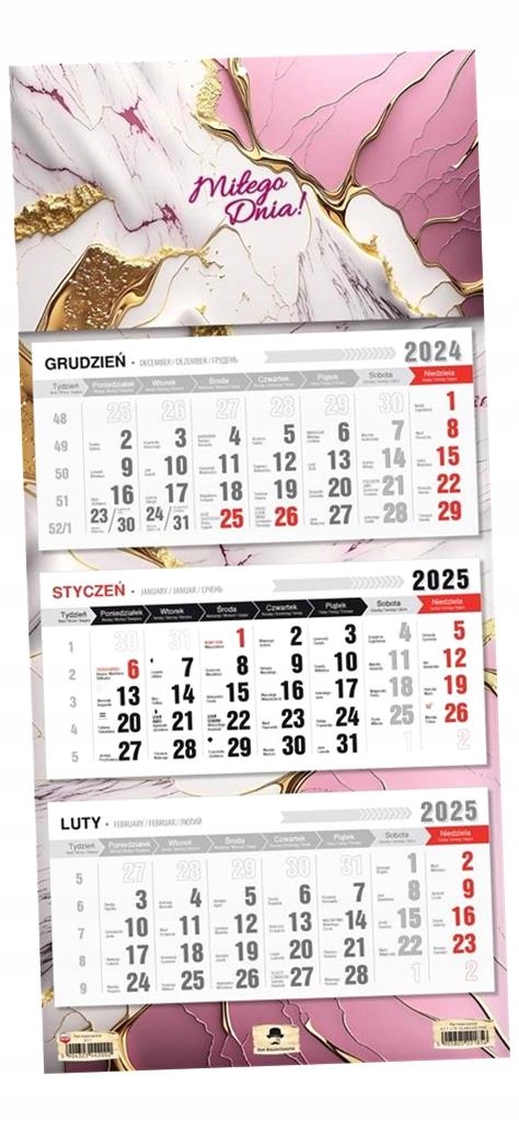 Тристоронній календар з плоскою головкою. Формат 315/680 мм. Три набори класичних календарів з висувним віконцем. Головка з просвердленим отвором. Додатково назви місяців та днів тижня українською, англійською та німецькою мовами. Календар додатково містить фази місяця та знаки зодіаку. Багато місця для нотаток, розбірливі великі літери та цифри.