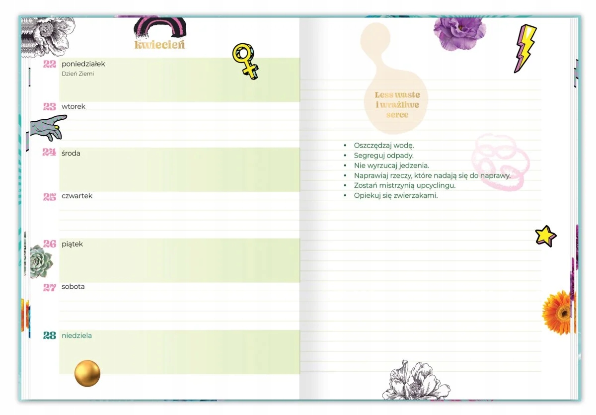 Кожен тиждень займає одну сторінку, а на протилежній сторінці є місце для будь-яких приміток. Крім того, на вибраних щотижневих сторінках є текст, цитата або вправа для саморозвитку.