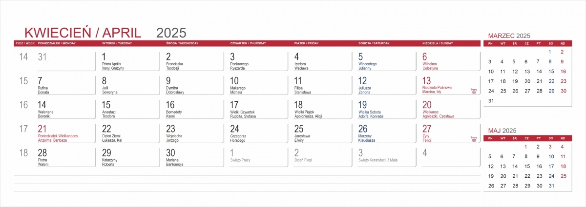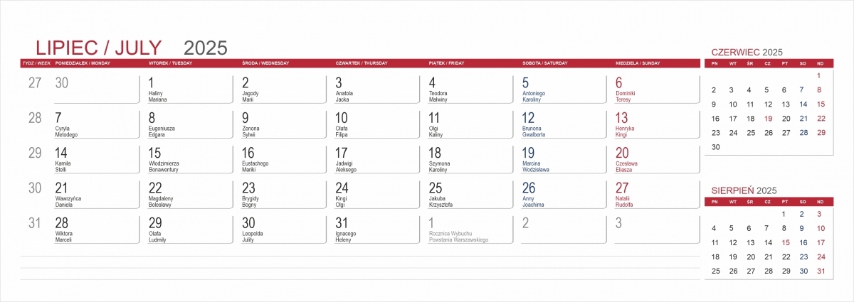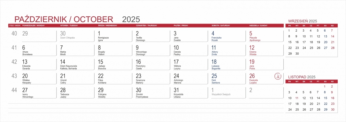 Великий, дуже практичний календар столу. Календар з січня 2025 по грудень 2025 року в щомісячній системі, де для нотаток, з названими іменами та святами. На кожній картці календаря ми знайдемо короткий календар попереднього та наступного місяця, з грудня 2024 по січень 2026 року. Календар позначається днями та святами. Прозорий макет календаря, місце для примітки про кожен день року та кількість тижнів полегшує умови планування та управління виконанням завдань.