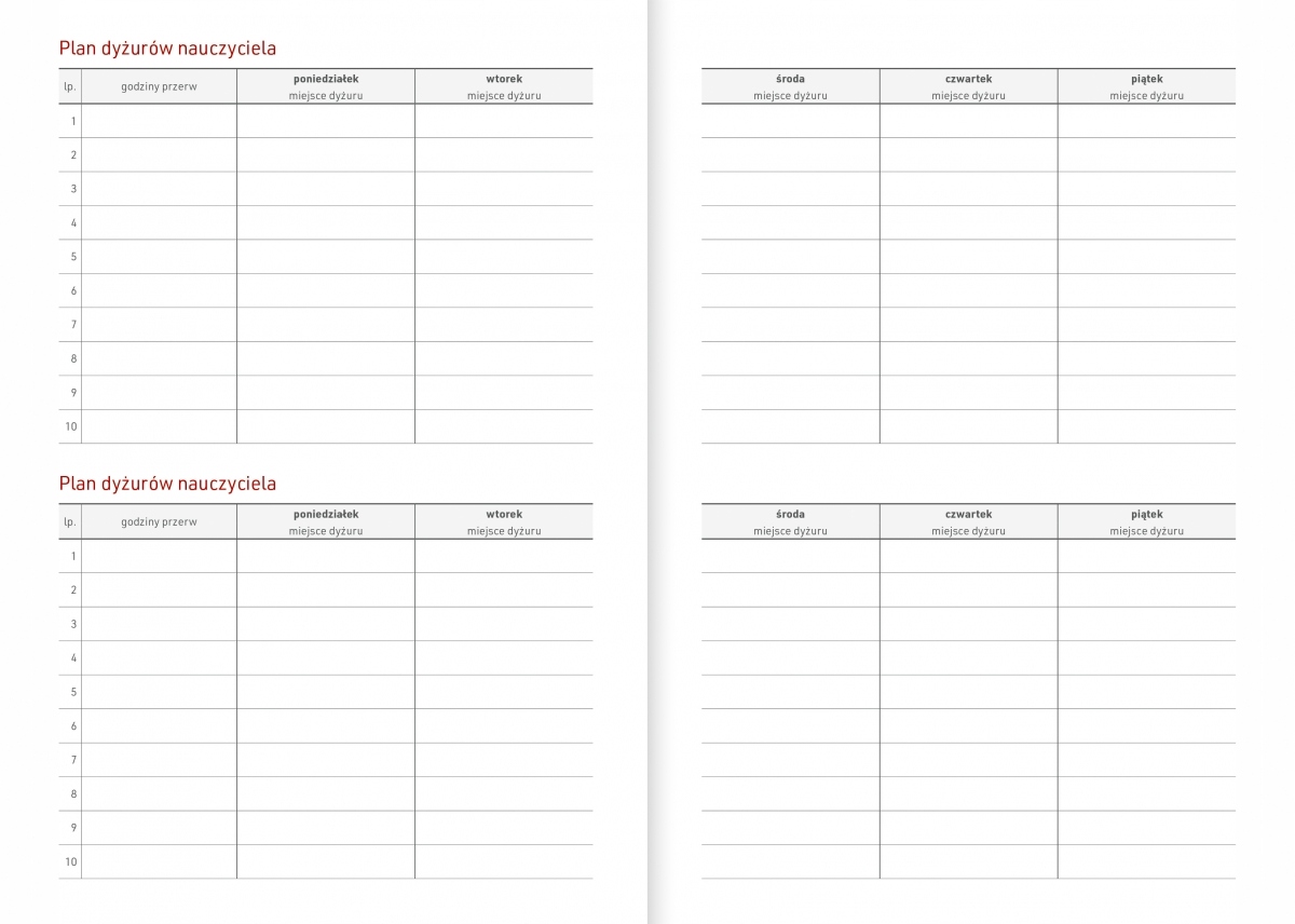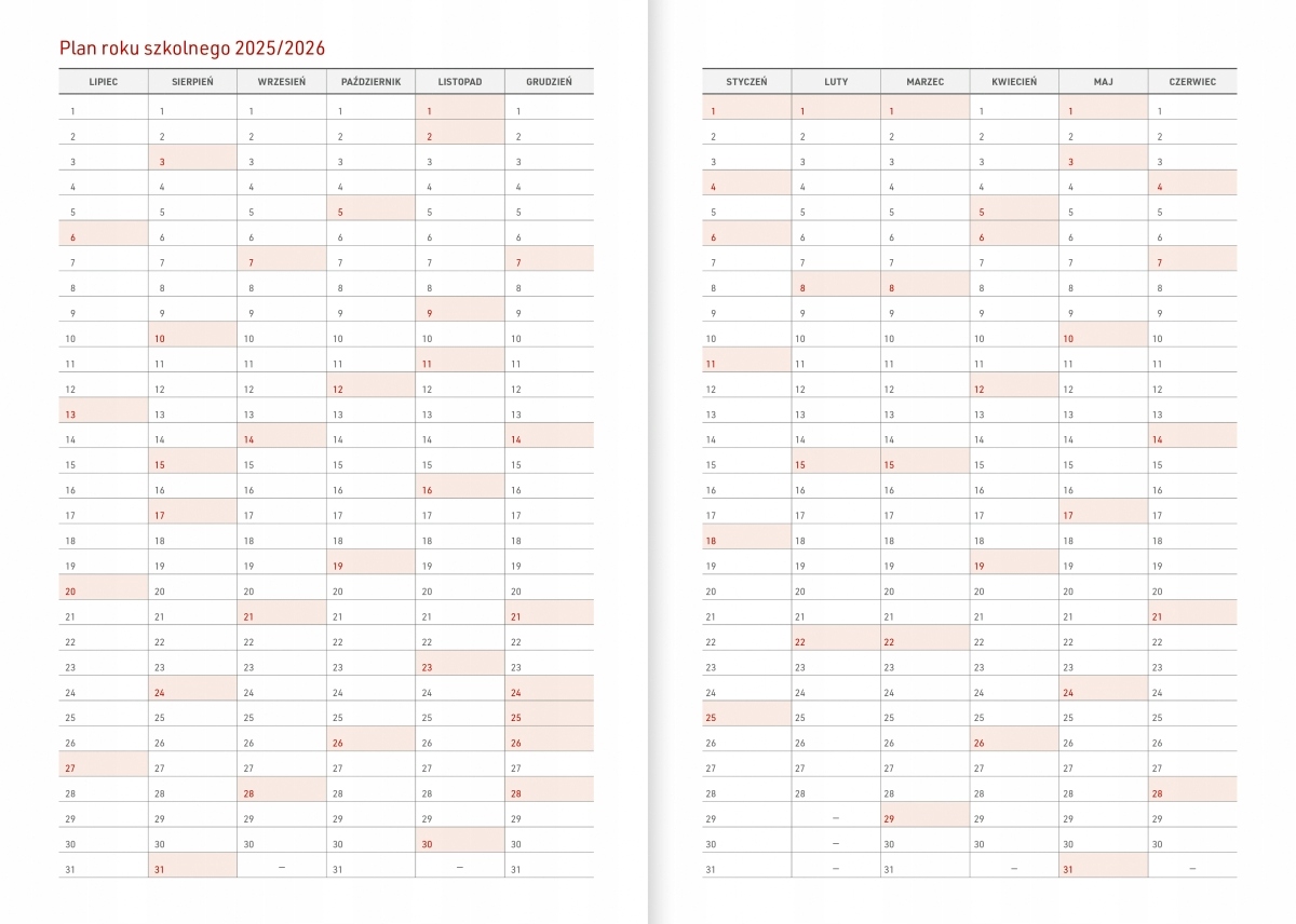 - Планек 2025/202 2025/2026 (from July 2025 to October 2026) - subsequent months of the school year in columns with space for notes at each day