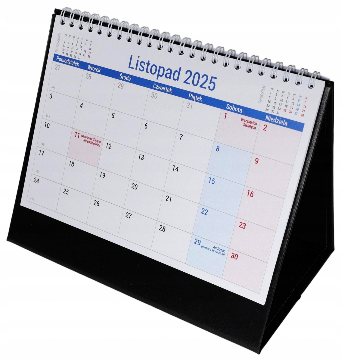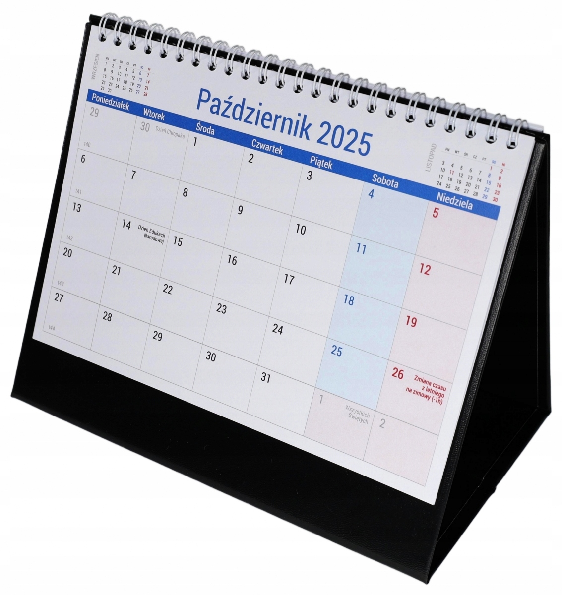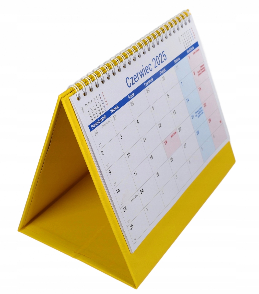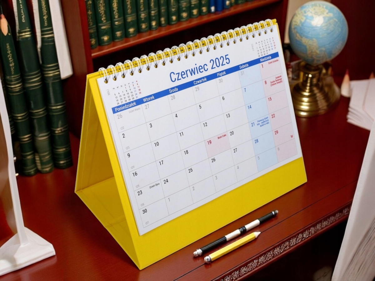 Практичний календар для розміщення на столі. Посилена основа з ексклюзивним шпоном забезпечує довговічність і естетичний вигляд календаря. Великий прозорий календар полегшує планування та керування термінами. Кожного дня є місце, щоб відзначити важливі події або зробити короткий запис. На кожній картці-календарі ми маємо скорочений календар попереднього та наступного місяця. Календар включає неробочі дні, окремі звичаєві та релігійні свята та господарські неділі.
