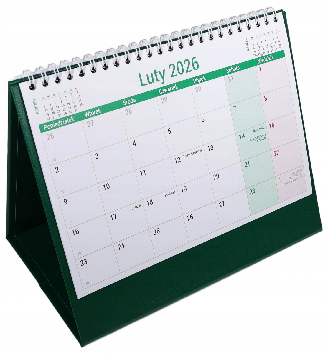 Практичний календар для розміщення на столі. Посилена основа з ексклюзивним шпоном забезпечує довговічність і естетичний вигляд календаря. Великий прозорий календар полегшує планування та керування термінами. Кожен день має місце для позначення важливих подій або короткого запису. На кожній картці-календарі ми маємо скорочений календар попереднього та наступного місяця. Календар включає неробочі дні, окремі звичаєві та релігійні свята та господарські неділі.