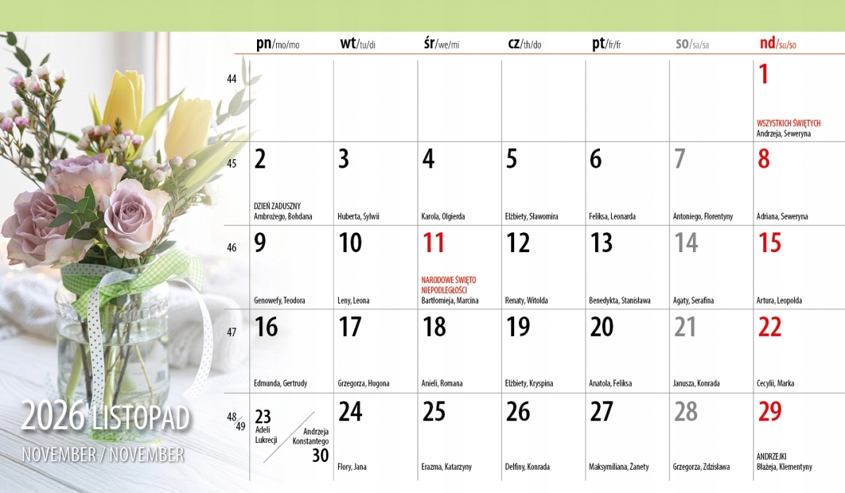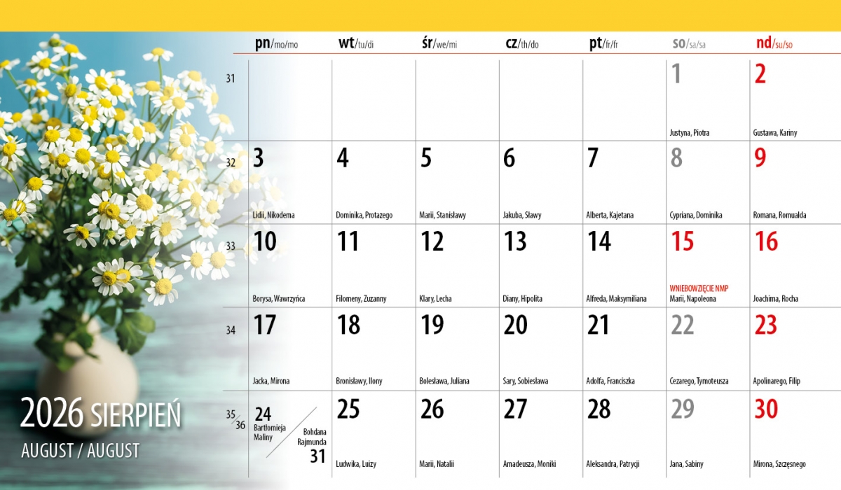 Місце для короткого запису на кожен день. У календарі — іменини, національні, релігійні та особливі свята.