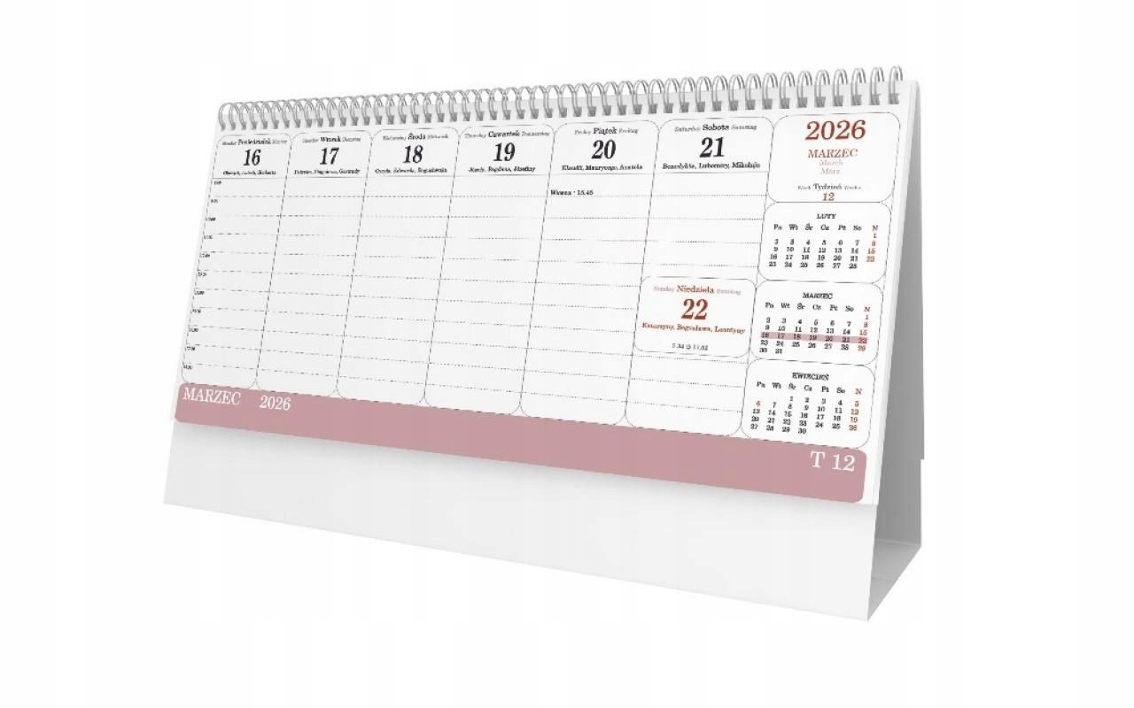Формат: 29 х 15 см, 56 сторінок Верстка: 1 тиждень на сторінку з місцем для нотаток Друк, папір: 2 кольори, білий папір 70 г/м2 Календар: польською, англійською, німецькою мовами, потрійні іменини, світанки та заходи сонця, нумерація тижнів, скорочений календар на рік. Палітурка: корінець, закріплений спіраллю на твердому картоні, сформованому в трикутну основу