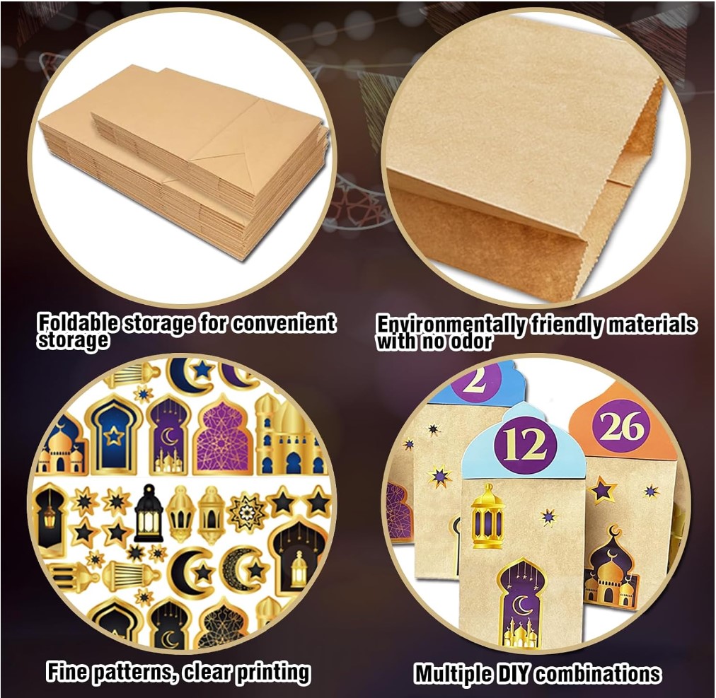 📦 Сумки календаря Рамадана - Зробіть: Створіть власний календар Рамадана для заповнення! Набір включає 30 коричневих паперових пакетів, наклейки з цифрами 1-30 та додаткові наклейки з мотивами зірок, місяців та замків. Під час очікування Рамадану можна прикрасити сумки і наповнити їх невеликими подарунками або солодощами.