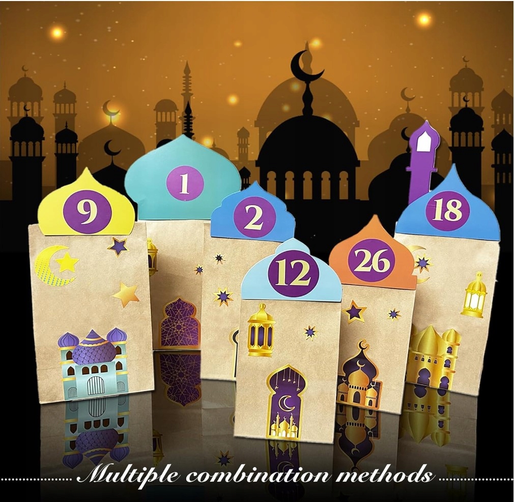 ✨ Спеціальний проект: Кожна сумка прикрашена красиво блискучими, золотими наклейками з друкованими номерами та мотивами зірок, місяців та замків. Святкуйте Рамадан з 30 мішками для подарунків та відповідних пронумерованих етикетках, створюючи чудове доповнення до традиційного Рамадану та святкової атмосфери.