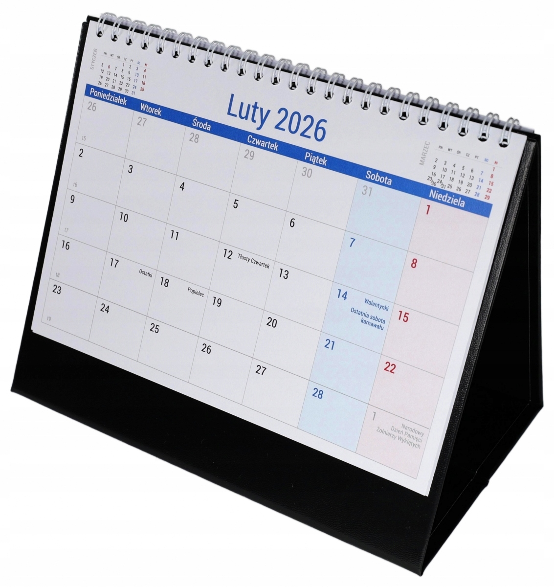 Практичний календар для розміщення на столі. Підсилений стенд у ексклюзивному шпоні забезпечує довговічність та естетичний вигляд календаря. Великий прозорий календар полегшує планування та управління термінами. Кожен день є місце для відзначення важливих подій або проведення короткої записки. На кожній картці календаря є скорочений календар попереднього та наступного місяця. Календар відзначав неробочі дні, вибрані звичні та релігійні канікули та комерційні неділі.
