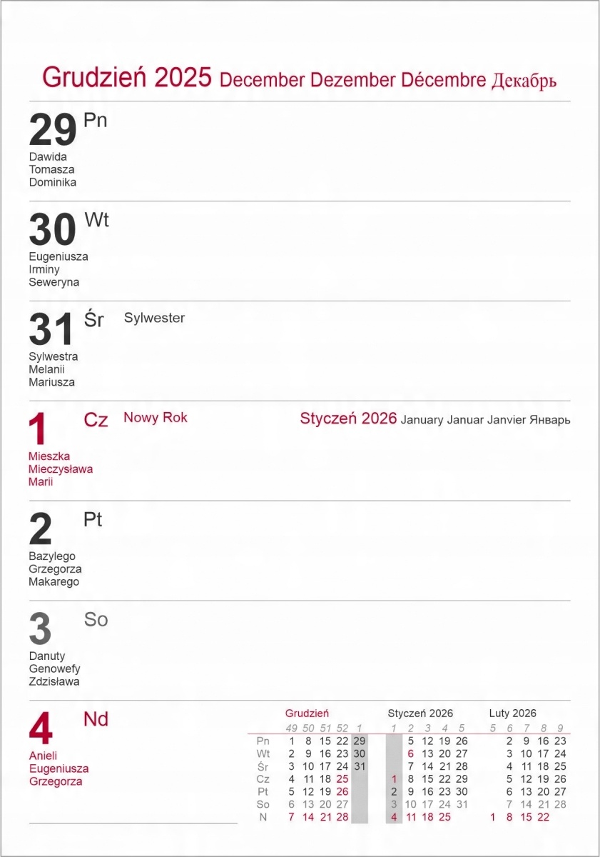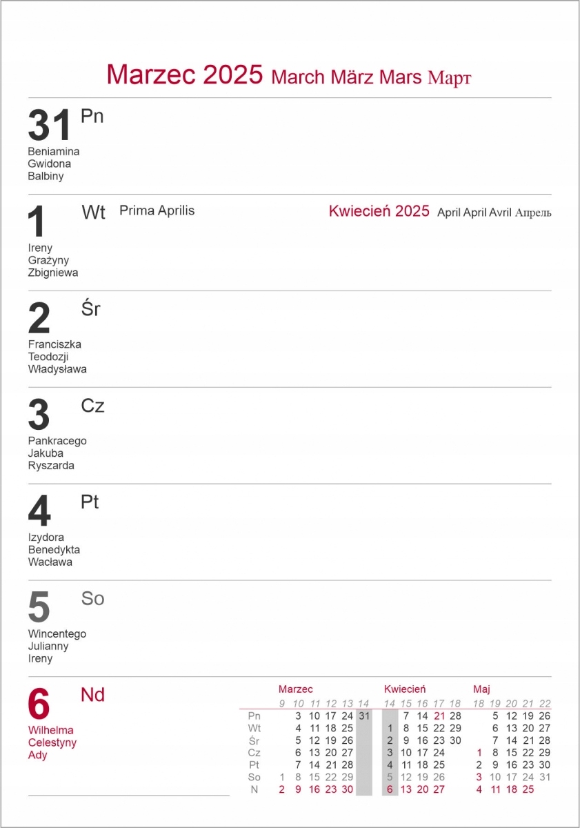 Крім того, календар позначається днем імені, державними та релігійними святами. На початку календаря розміщується прозорий план цілого 2024, 2025 та 2026 рр.