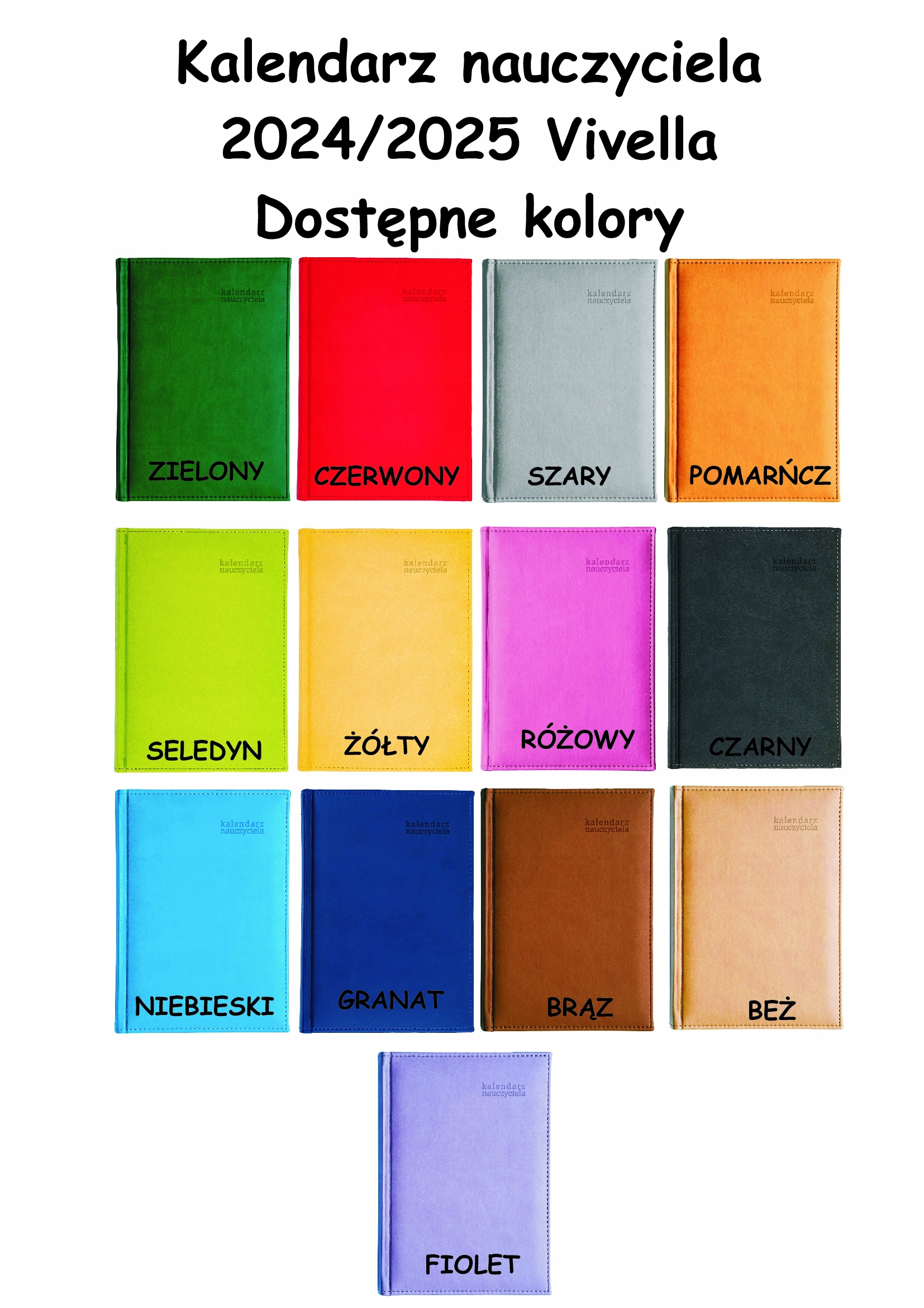 Зручний планувальник у гарній, перевіреній формі з практичним і зрозумілим макетом календаря в палітурці Vivella. Багато місця для записів. Корисні адреси та посилання, велика інформаційна частина збагачена таблицями, корисними в роботі вчителя. Надруковано на білому папері; блоки планувальника, прошиті ниткою; біла пов'язка і стрічка. Календар з 24 червня 2024 р. по 7 вересня 2025 р. Місяці VII і VIII скорочено: два тижні на одній сторінці. Місяці з вересня по червень у тижневому розкладі на двох сторінках. Палітурка дозволяє друкувати, тиснути та персоналізувати календар.