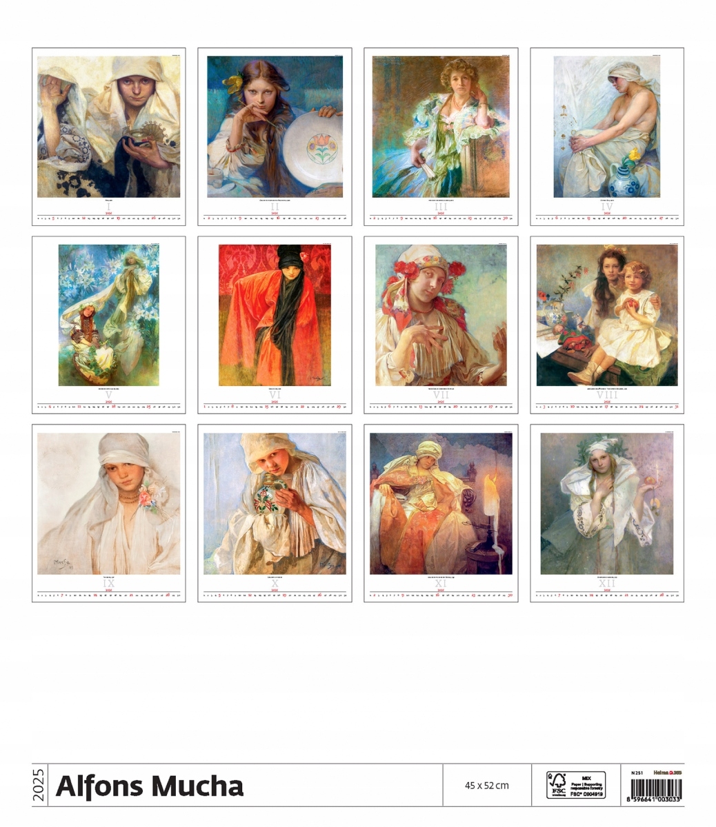 Календар Альфонса Мухи 2025 видавництва «Гельма 365» виділяється серед представлених на нашому ринку календарів із репродукціями творів Альфонса Мухи. Картини були представлені на дошках розміром 45 х 52 см.