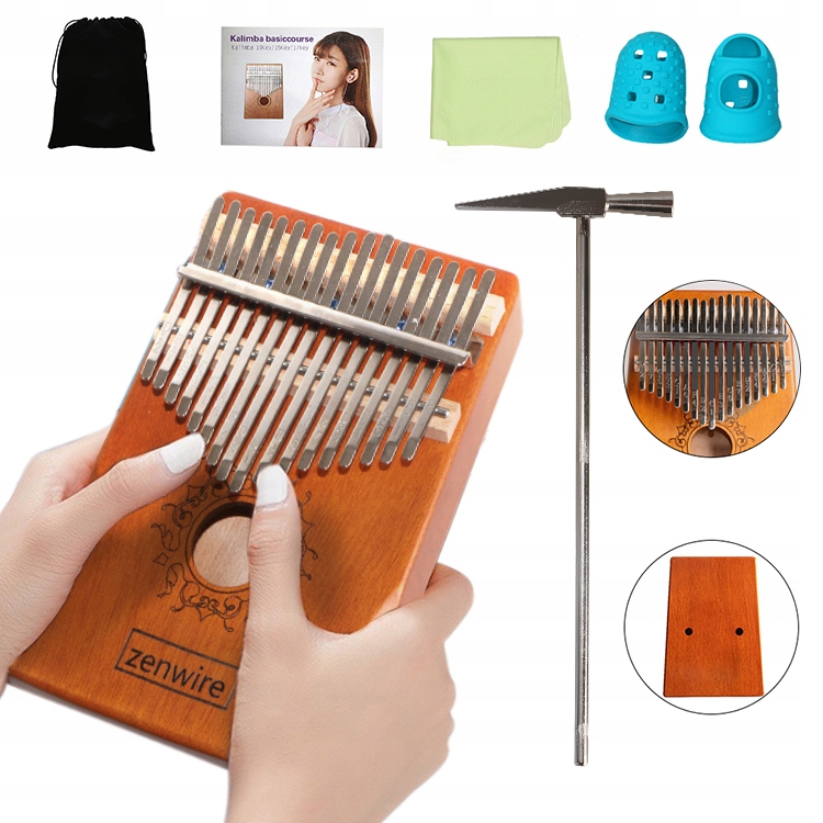 - В комплекті: Kalimba Zenwire, оксамитовий чохол, молоток для налаштування, подушечки для пальців. наклейки, серветка для чищення, буклет з інструкціями, посібник польською мовою, оригінальна упаковка Zenwire.