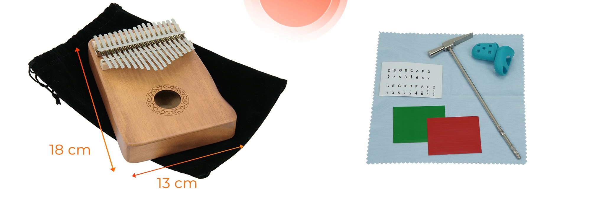 ✅ Повний комплект аксесуарів: калімба, молоток для налаштування, чохли для великих пальців, тканина, кольорові наклейки для позначення тонів, обкладинка, посібник користувача