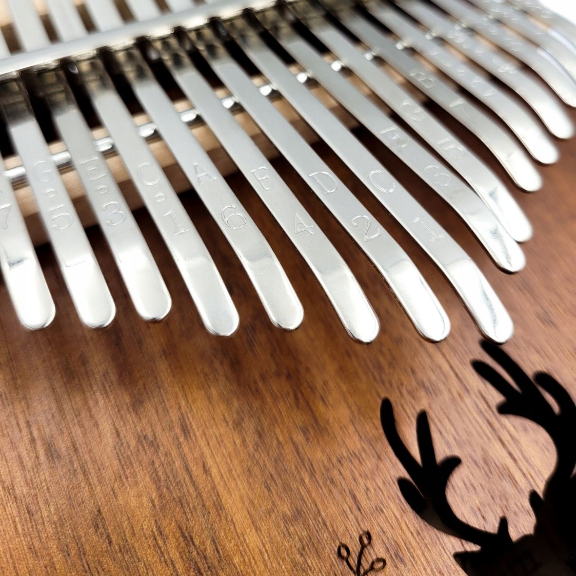 - Оригінальна калімба, повністю дерев’яна, з прикрашеним звуковим отвором із зображенням північного оленя