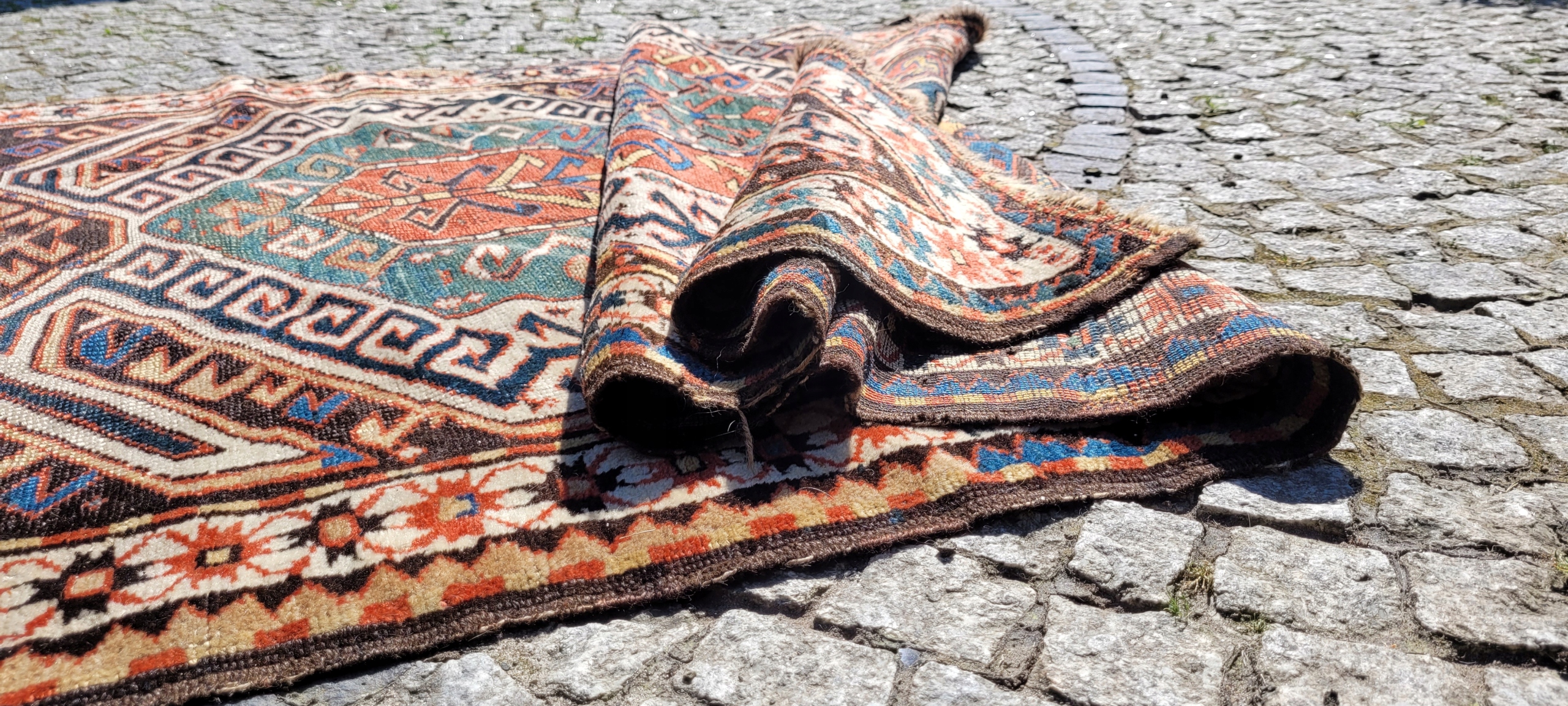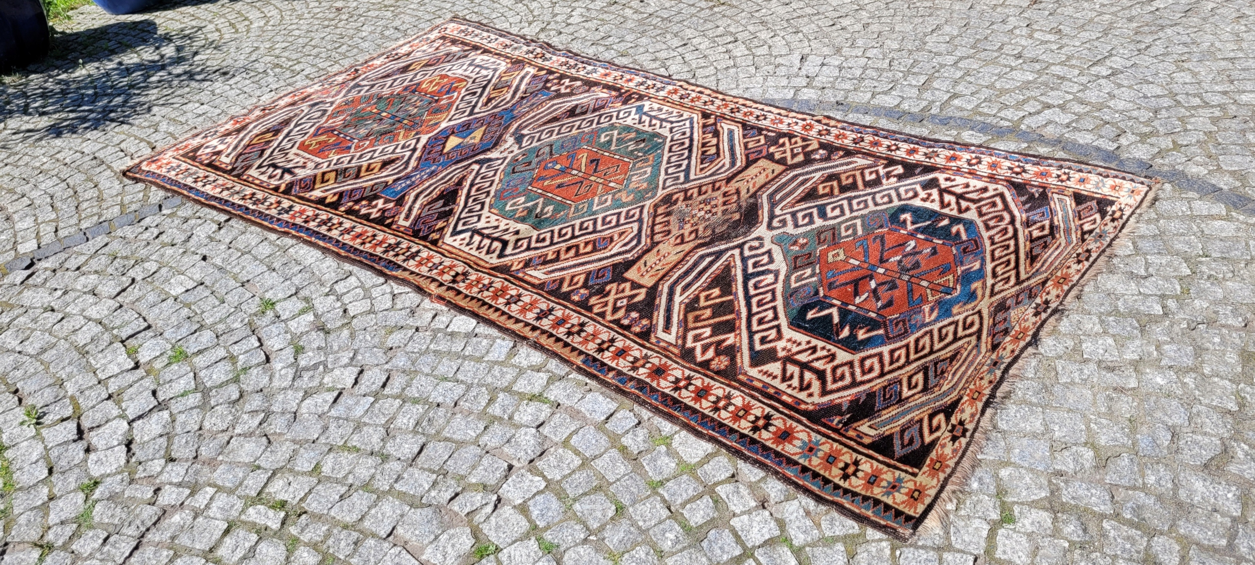 Гарний, старовинний, кавказький казахський килим. Виткана вручну з вовни найвищої якості. Він характеризується компактним флісом і красивими кольорами та візерунками. В хорошому стані, видно на фото. Має потертості та асиметрії. Предмет колекціонування.