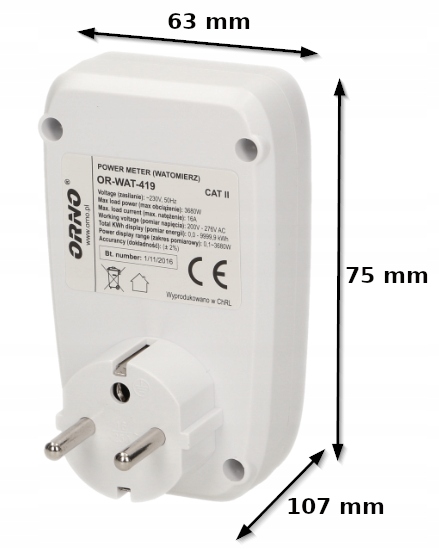 ВАТМЕТР Orno OR-WAT-419 дозволяє перевірити споживання електроенергії та розрахувати енерговитрати підключеного пристрою. Його можна використовувати лише зі стандартними електричними розетками з напругою 230 В змінного струму. Максимальне навантаження на розетку не може перевищувати 3680 Вт.