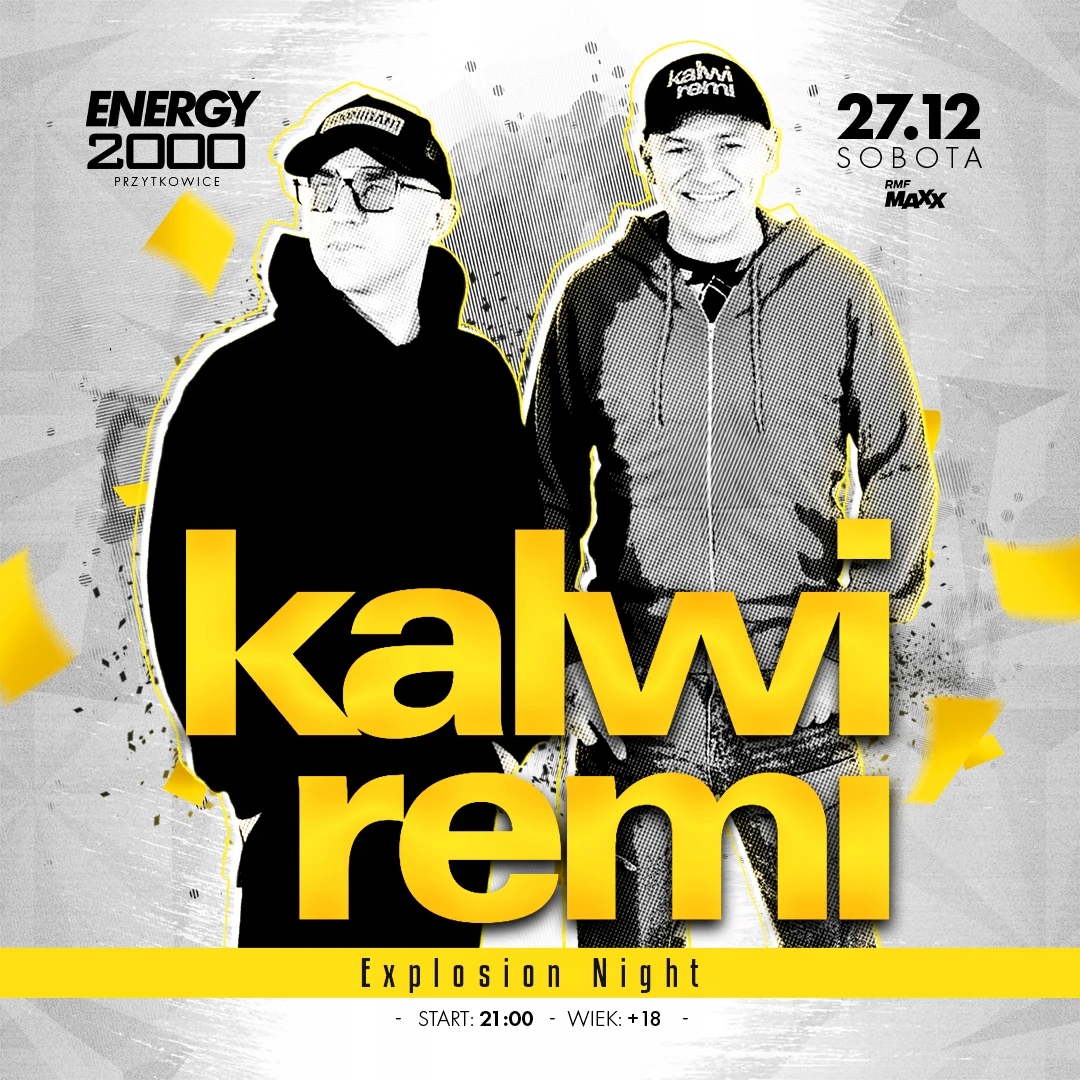 Готуйтеся до справжнього музичного вибуху енергії! За пультом Energy 2000 виступить легендарний дует Kalwi & Remi - квитки вже у продажу. Вік 18+ Kalwi & Remi в Energy 2000 Kalwi & Remi – творці найбільших клубних хітів, які назавжди увійшли в історію польської танцювальної музики! Ви почуєте їхні найвідоміші пісні: «Explosion», «Imagination», «Stop (Falling Down)», «Kiss», «Find You» та багато інших хітів, які сколихнуть наш танцпол! Початок: 21:00 DJ set у головному залі близько 1:00 Зверніть увагу: ці години є приблизними та можуть змінюватися.