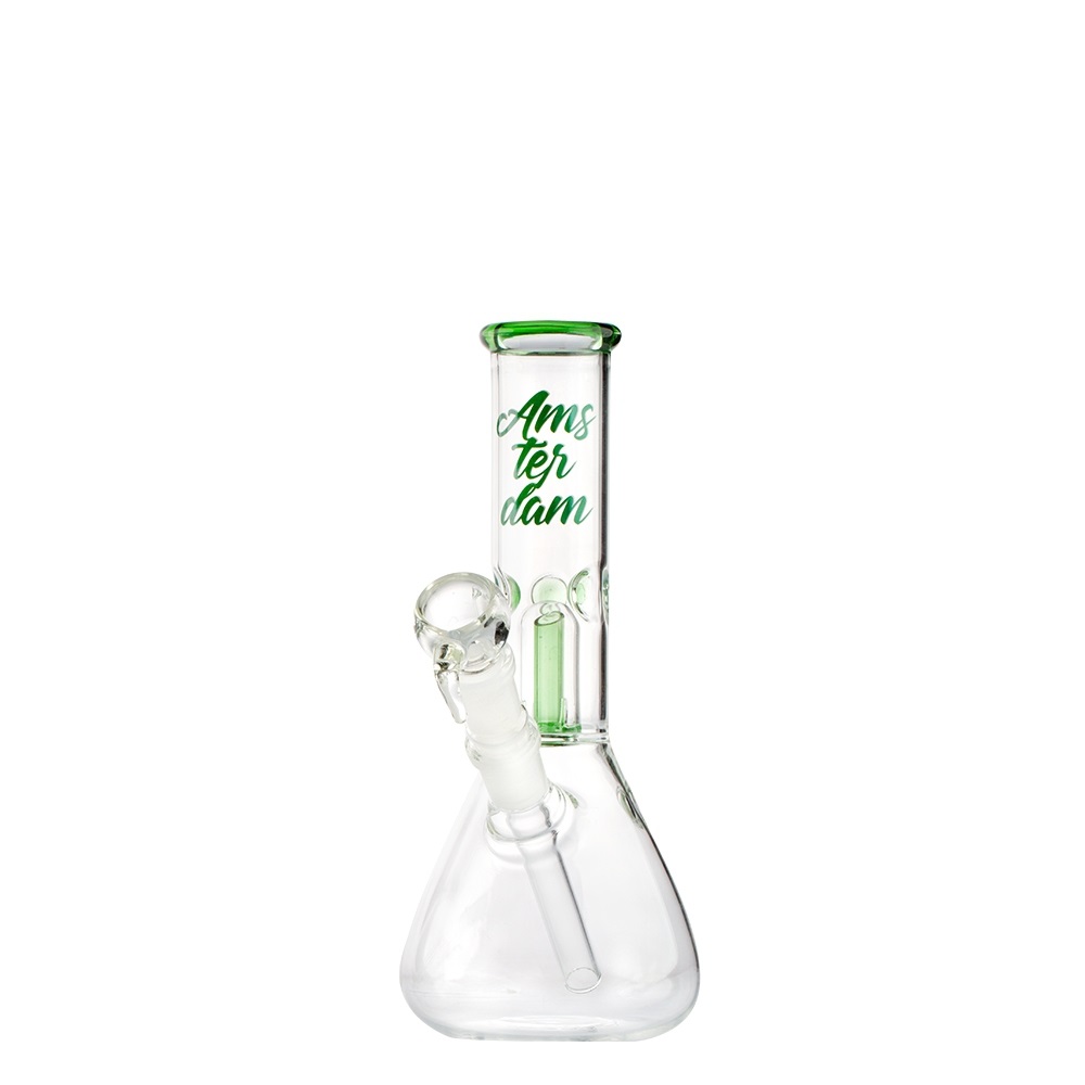 Бонг Amsterdam High з перколятором з високоякісного скла. На шиї напис Amsterdam. Bogno має перколятор, який додатково фільтрує дим через воду.