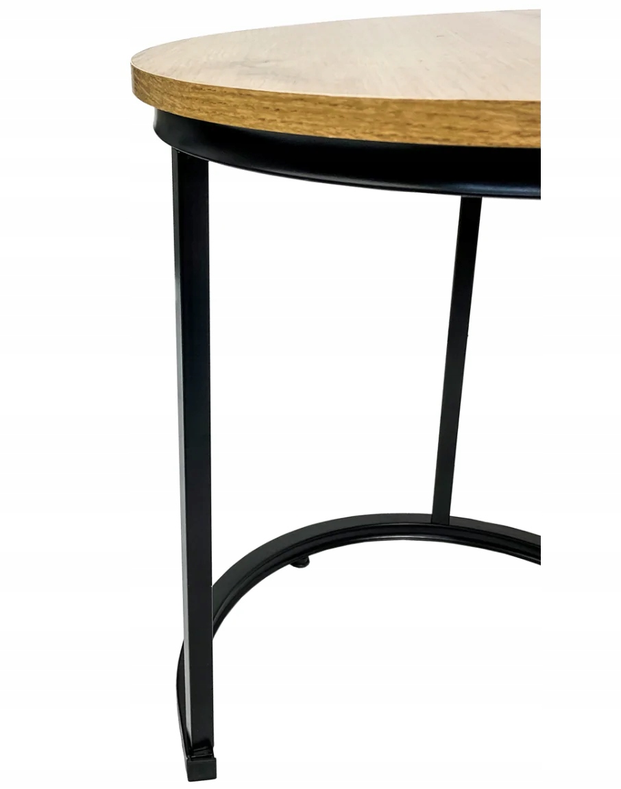 Практичні два столи зі сталевим каркасом для вітальні, кімнати або спальні. Зміцнено внизу. Унікальний та унікальний промисловий вигляд. Легка та інтуїтивна збірка. Столичні вершини в дубовому кольорі. Чорні сталеві профілі, пофарбований у порошок. Дві таблиці забезпечують комфорт використання та надання. Досить місця. Можливість вставити меншу таблицю під більшу. Матеріал: MDF, металева чорна рама. Розмір більшої таблиці: FI 45x48 см. Розмір диму меншої таблиці: FI 30х42 см. Упаковка: картон 49x47x9cm