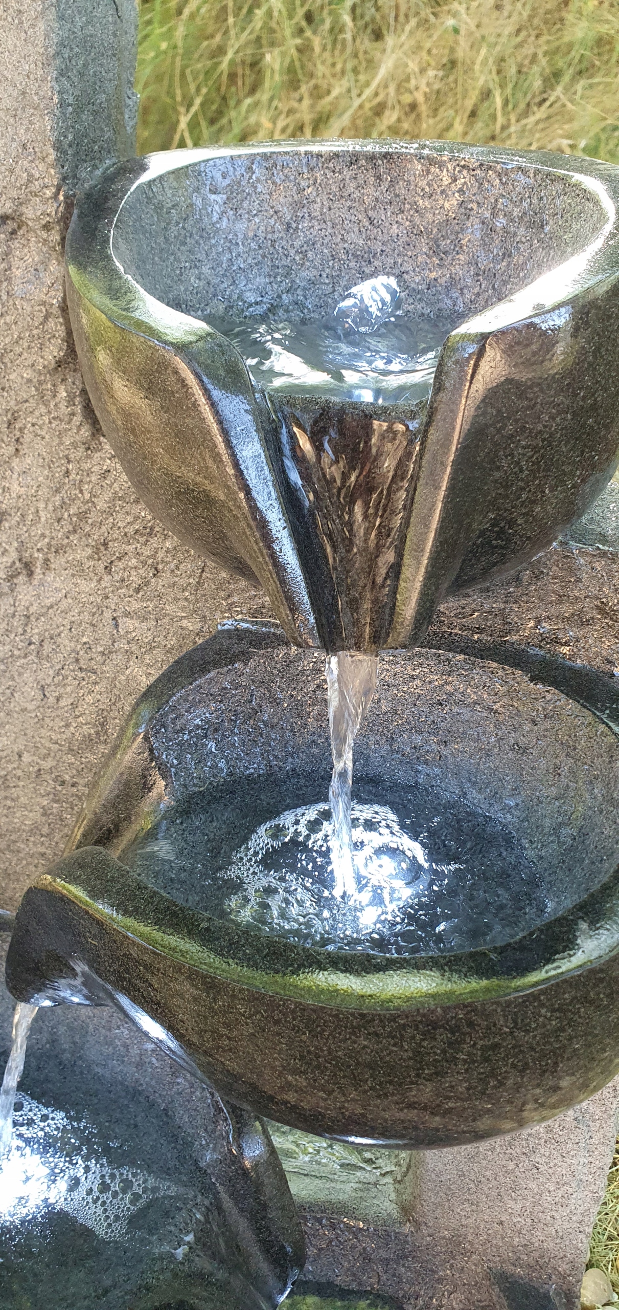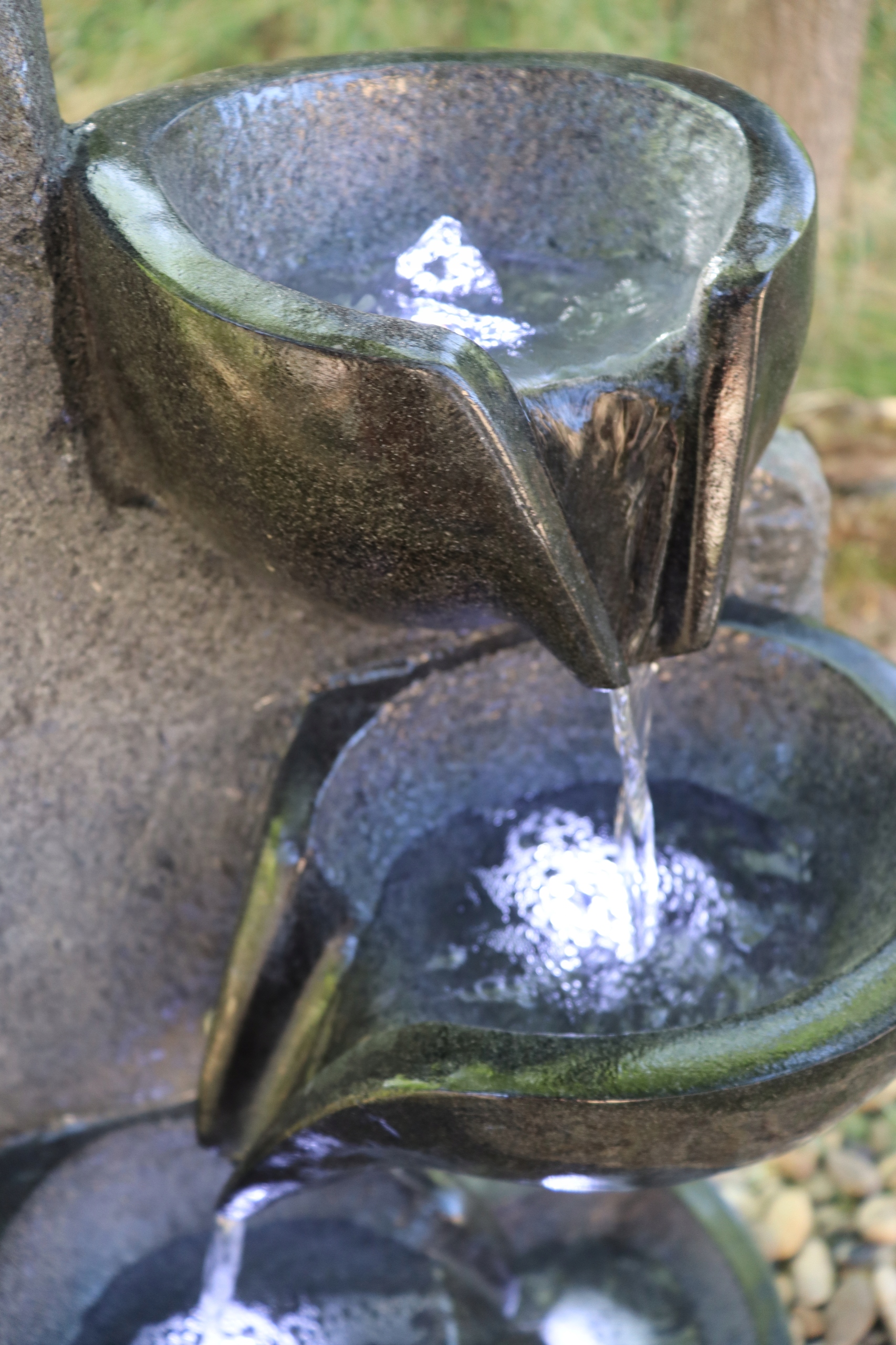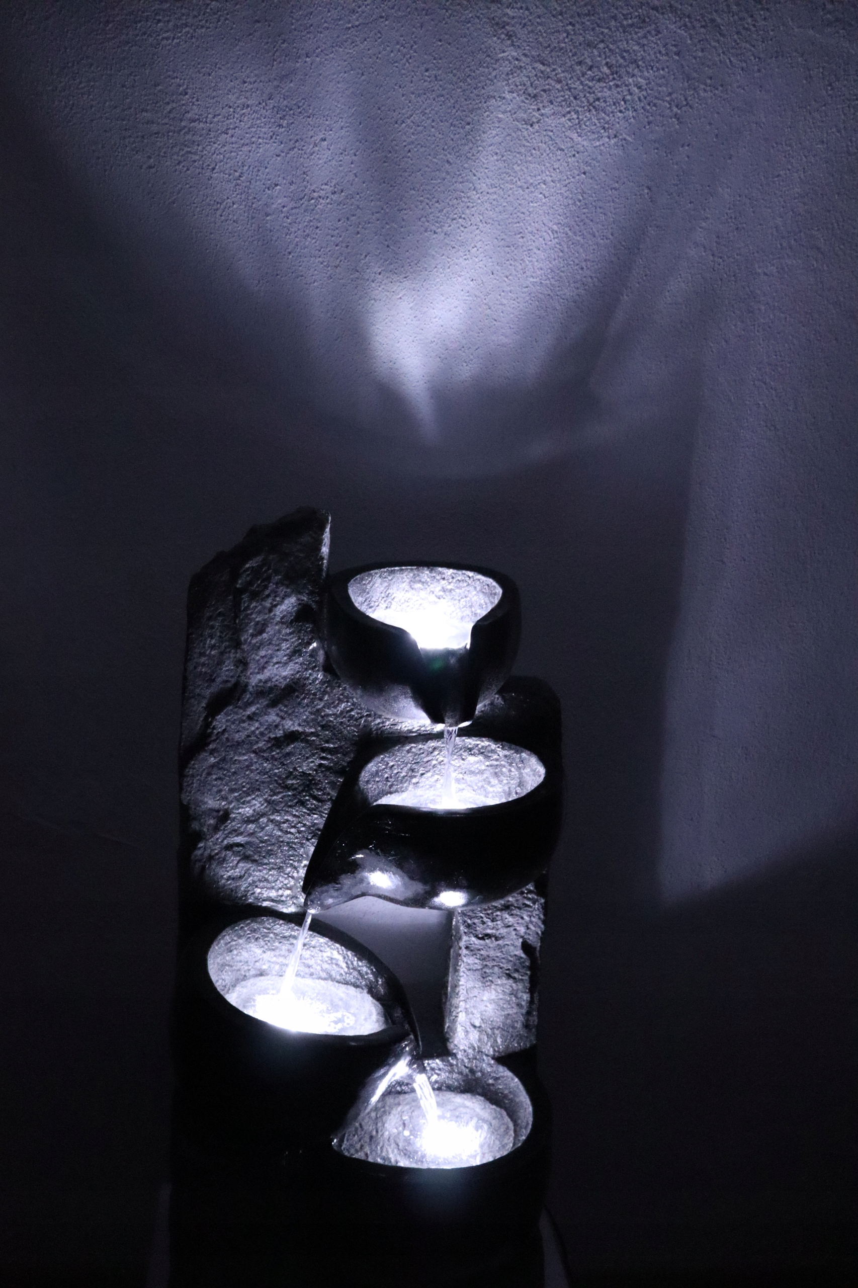 Вода вільно перетікає з однієї чаші в іншу, створюючи розслаблюючий природний звук, який заспокоює почуття та створює атмосферу спокою. М’яке світлодіодне освітлення, вбудоване в чотири точки фонтану, ефективно підкреслює рух води після настання темряви, надаючи простору унікальну атмосферу.