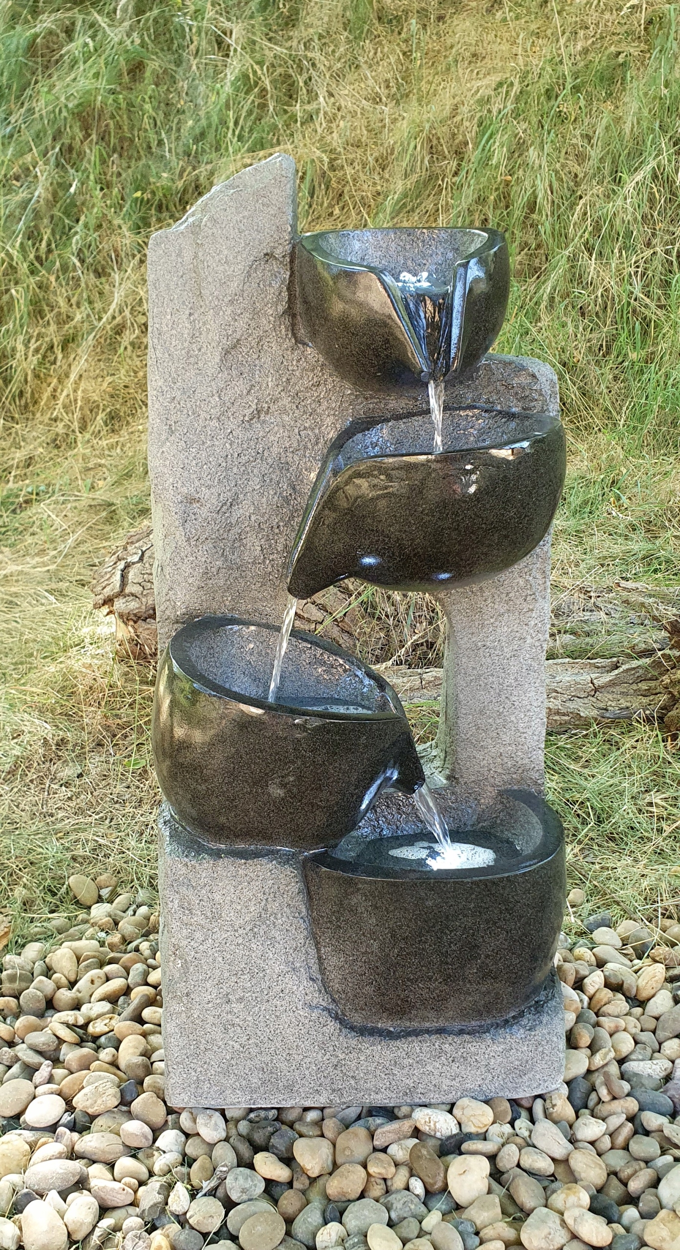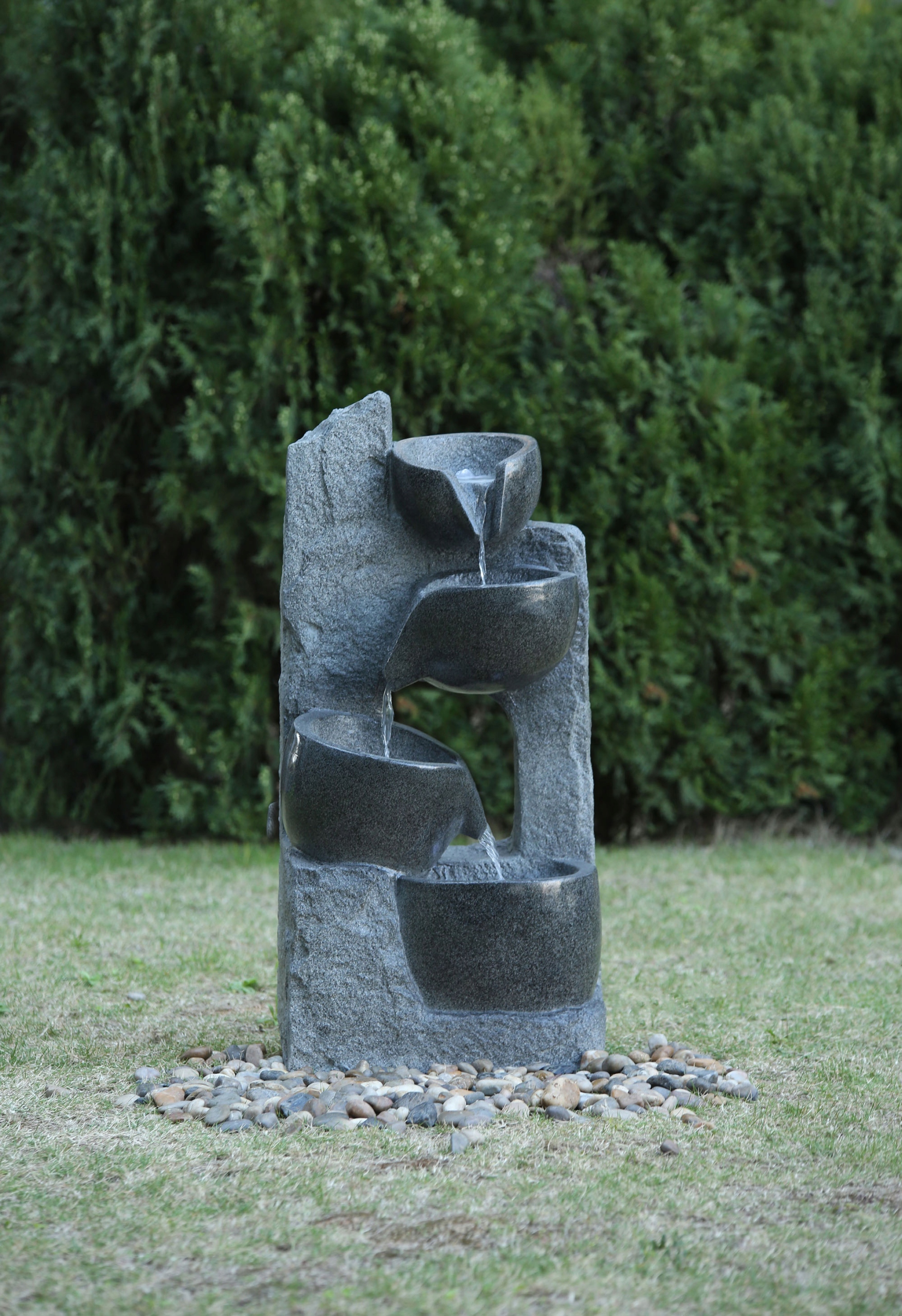 Створіть у своєму саду місце, повне гармонії та стилю, за допомогою каскадного фонтану з чотирма чашами. Це елегантна і міцна конструкція, виготовлена з композиту, доповненого природними мінералами: кварцом, алебастром, базальтом, мармуром і кварцовим борошном. Товсті міцні стінки забезпечують виняткову стійкість до механічних пошкоджень, УФ-випромінювання та екстремальних температур - від -40°C до +110°C.