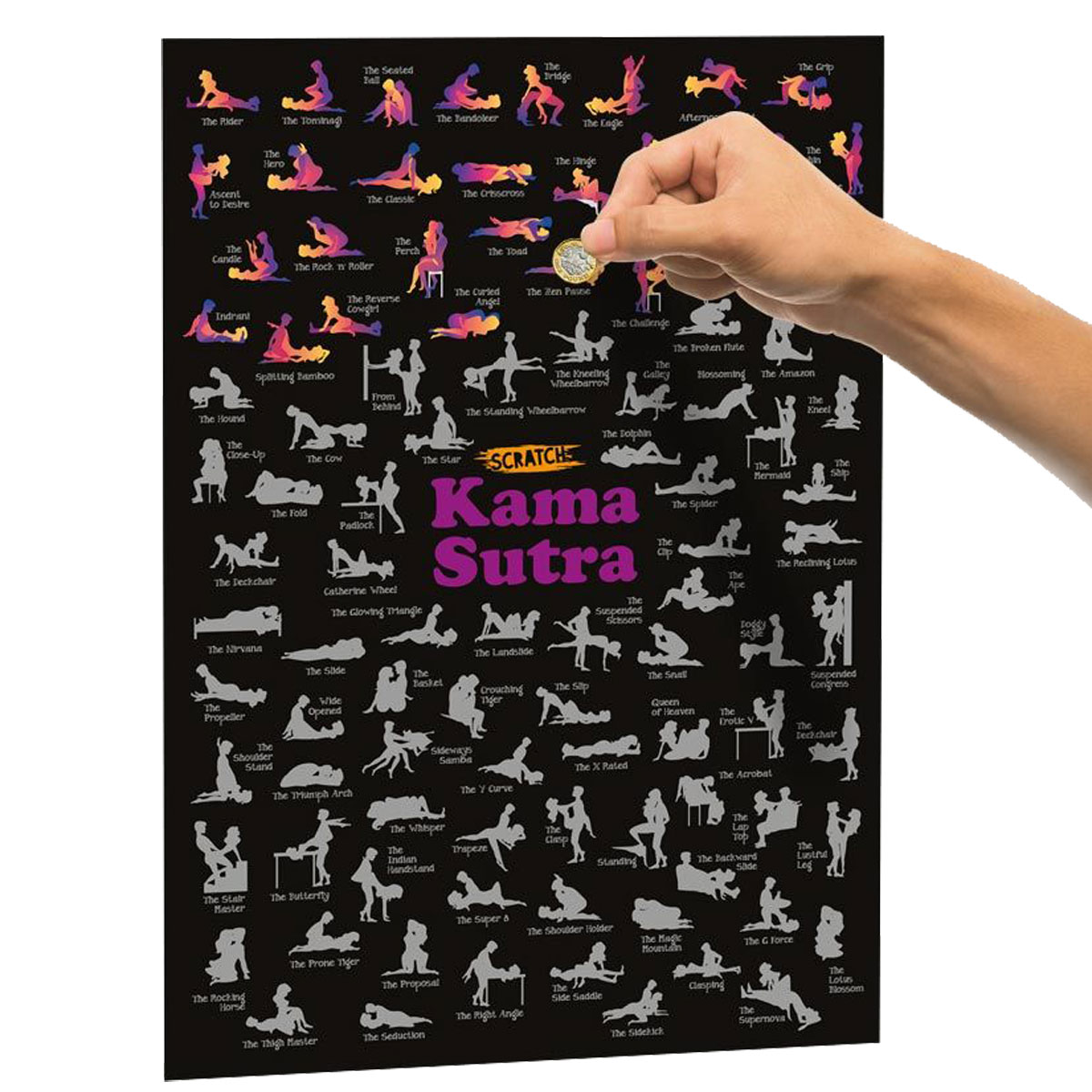 Цей плакат містить 100 різних сексуальних поз, які описані під кожним зображенням. Більше того, ви чітко бачите, що вас чекає, тож вибираєте сьогоднішню форму розваги з повною усвідомленістю. Чи матимете ви можливість скинути всі 100 речей, чи обмежитеся одним нещодавно відкритим і чудовим досвідом? Також від вас залежить, чи подряпає даний елемент ваш партнер, чи ви приймете рішення разом. Дізнайтеся, як далеко заведе вас у інтимну подорож із скретч-плакатом Камасутри