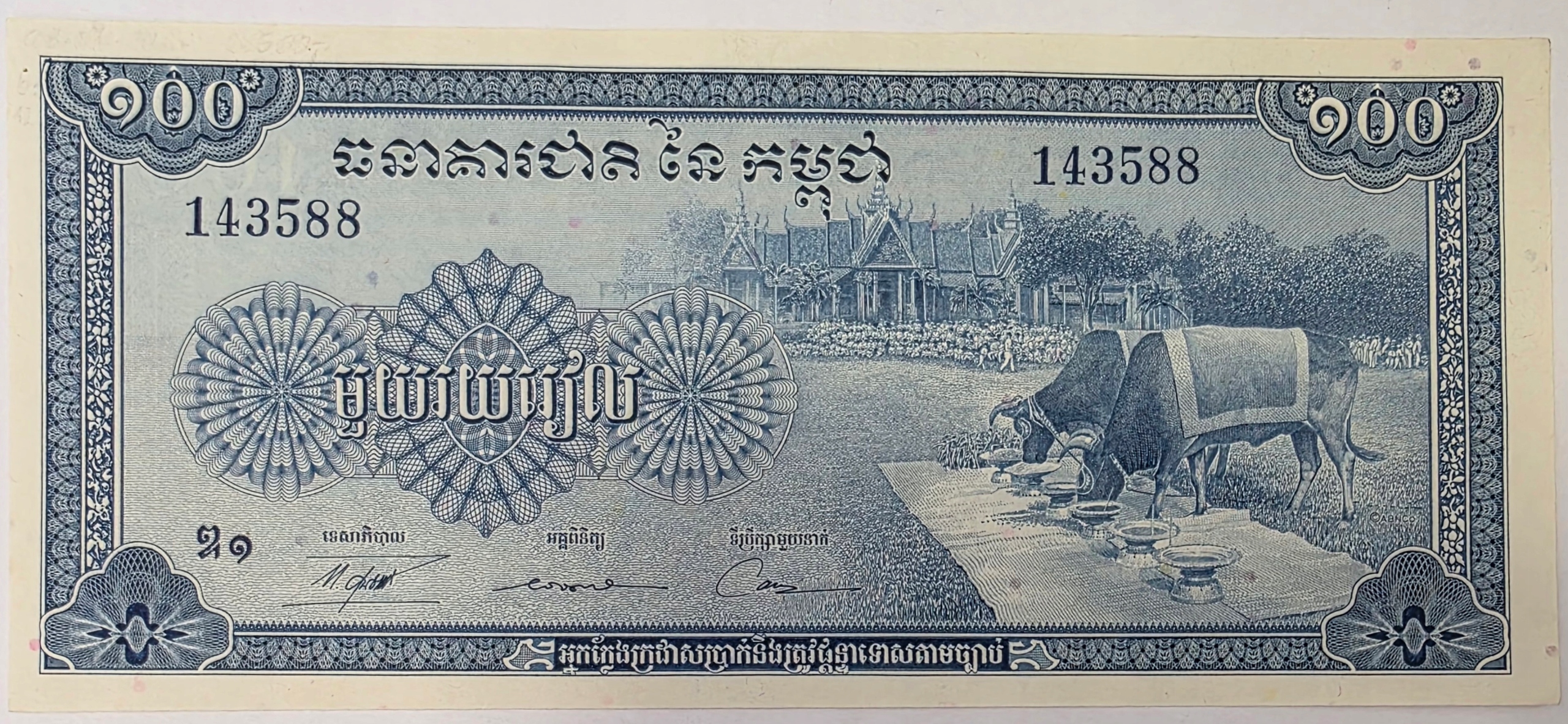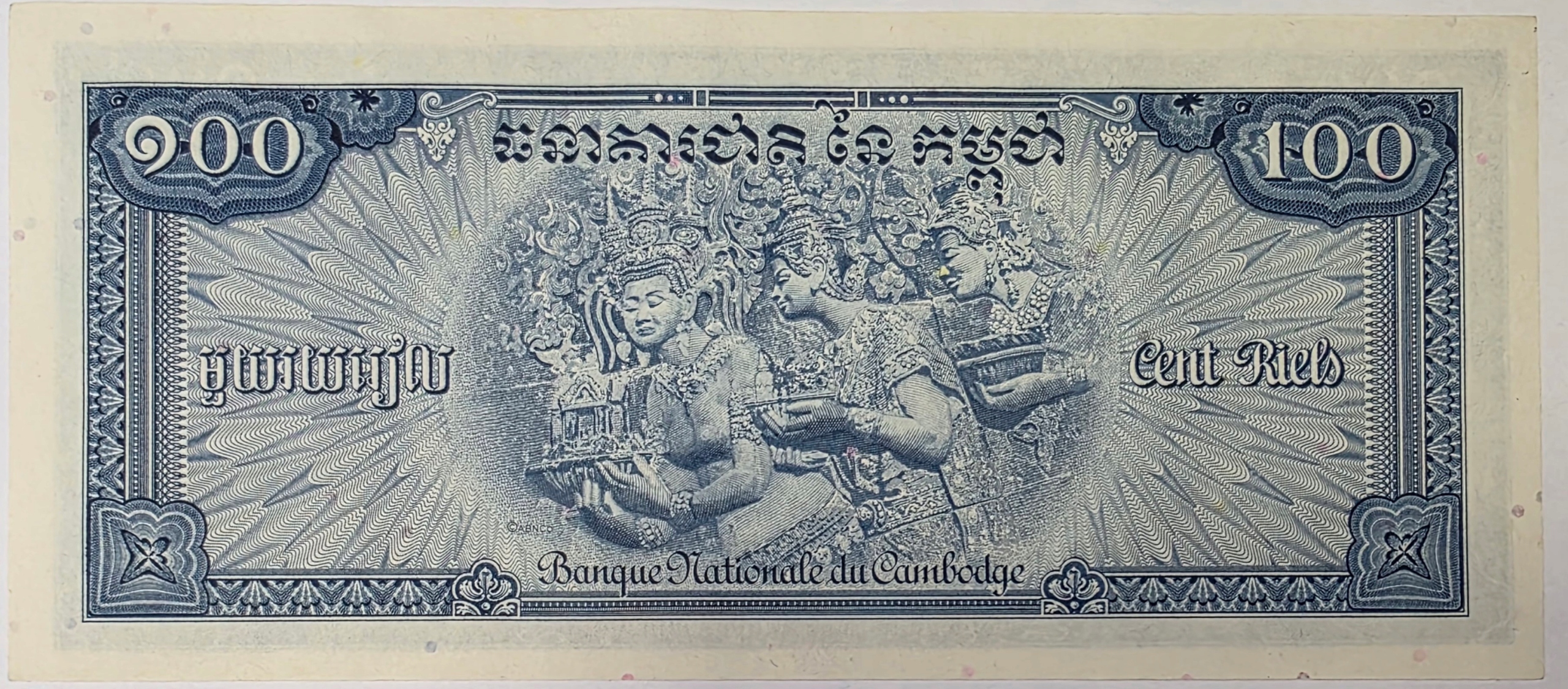 Оригінальна банкнота номіналом 100 Рієлів із Камбоджі 1956 року – перша серія, яка була обіговою після відновлення незалежності країни.