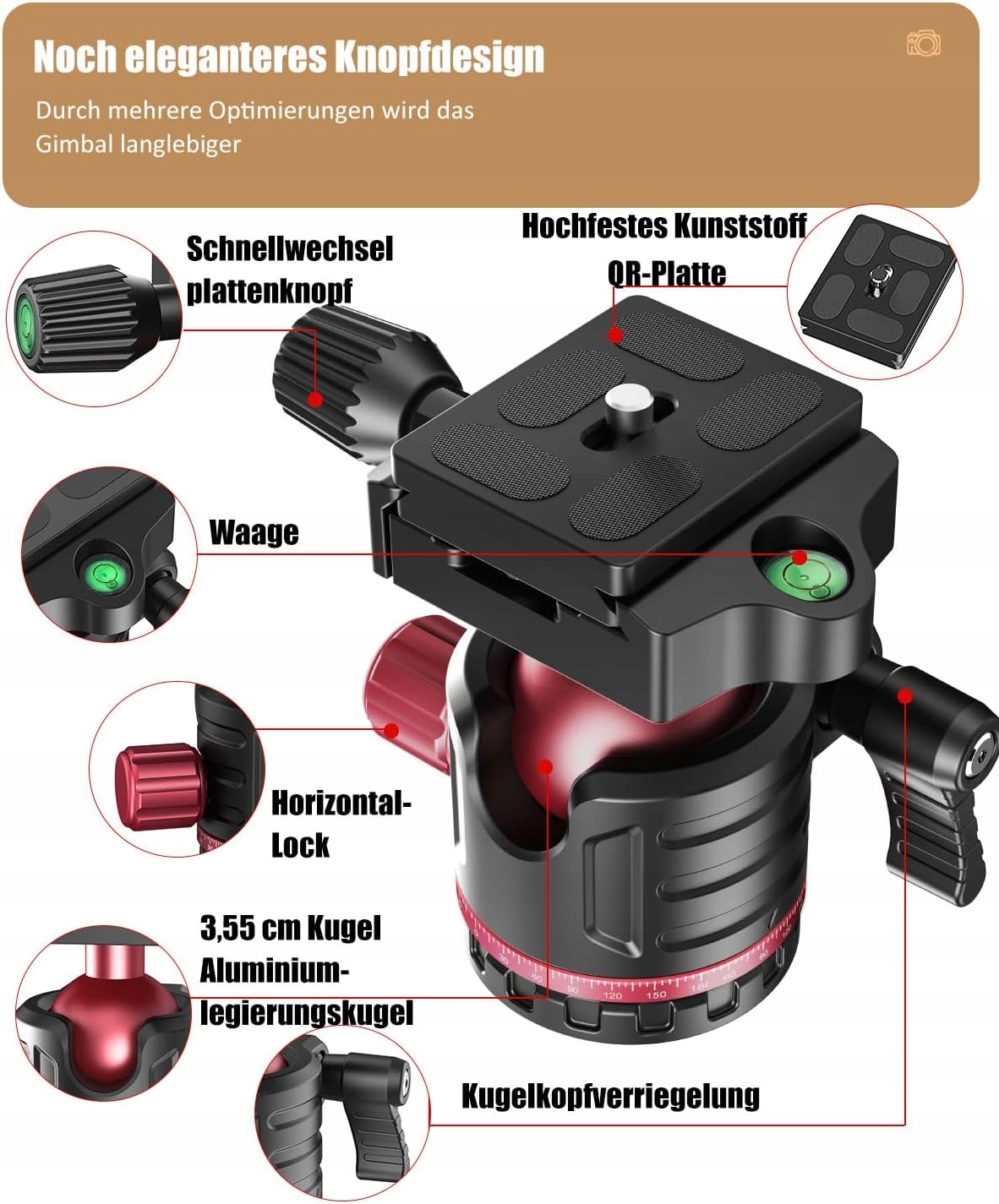 - Поліпшення нового виробництва: ми значно покращили якість цього штатива: 1. Компоненти штатива виробляються методом фрезерування ЧПУ, що призводить до мінімальної толерантності. Завдяки цьому регулювання кута камери на головці кулі є таким же гладким, як шовк. 2. Ми оптимізували структуру головки кулі та видалили непотрібні аксесуари для подальшого зменшення ваги. 3. Елементи, що підтримують навантаження, відлиті в один шматок і виготовлені з технічного пластику з високою довжиною, що забезпечує виняткову міцність та легку конструкцію.