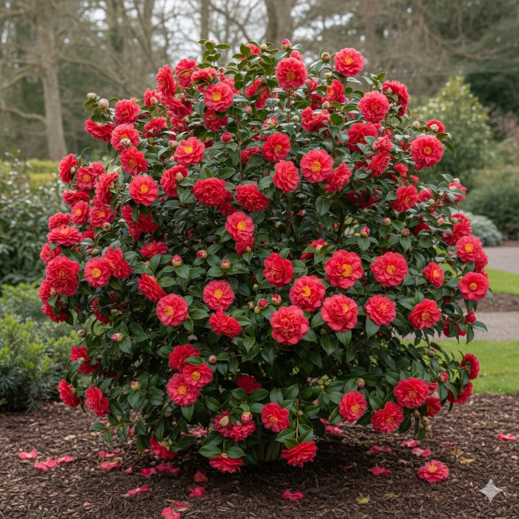 Японська камелія "Мері Вільямс" - справжній аристократ серед квітучих кущів. Її великі, напівзповні, інтенсивно червоні квіти з яскраво -жовтими стрижнями з’являються ранньою весною, вводячи в саду вражаючий кольоровий акцент, коли більшість рослин просто оживають. Це ідеальний вибір для всіх, хто цінує елегантність та унікальну красу.