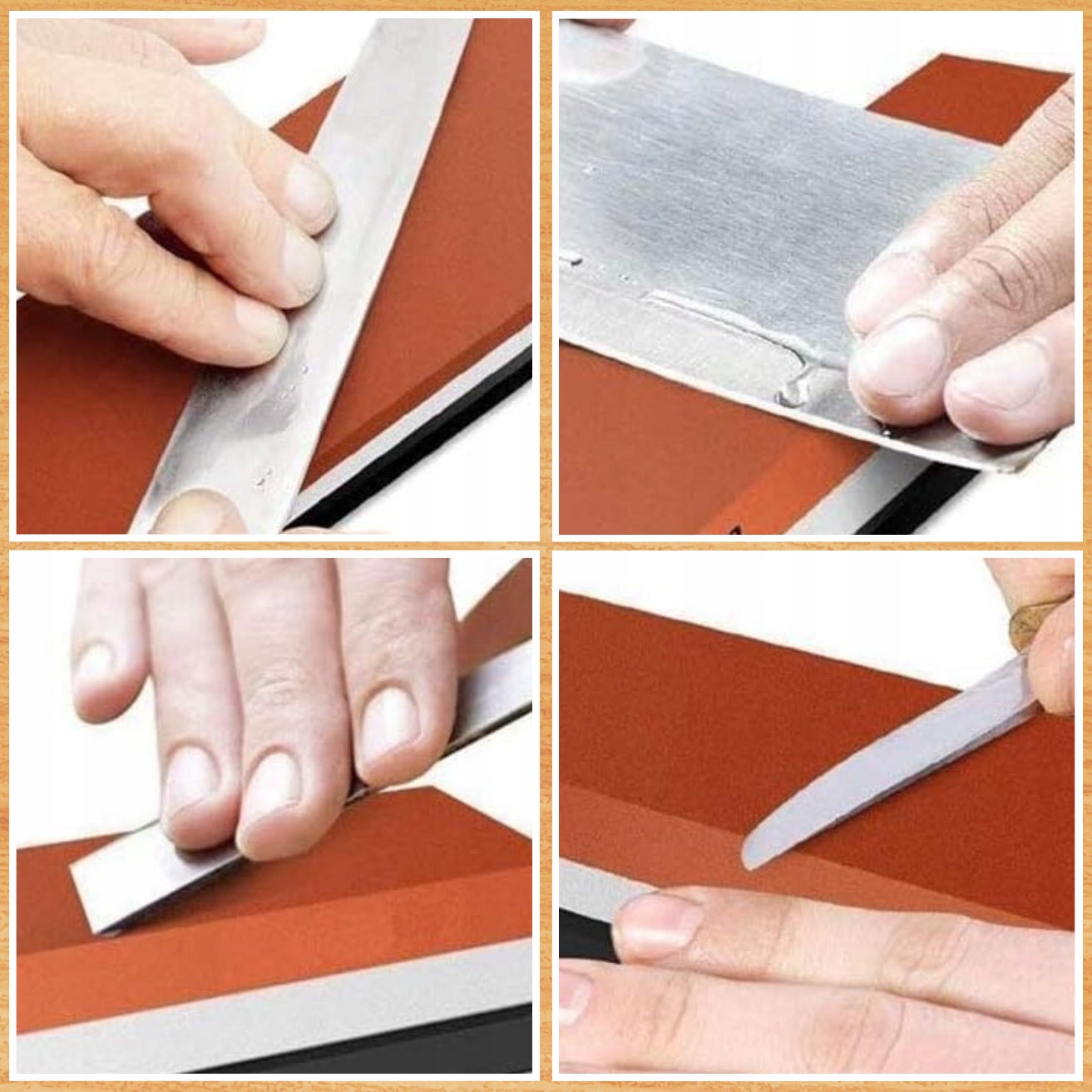 - Висока якість - Повний набір шліфувальних каменів з бамбуковою основою та не ковзаючою оболонкою, кутовим направляючим, каменем, що сплющується, силіконовою ручкою та шкіряним ремінцем. Продукт міцний і відповідає всім стандартам.