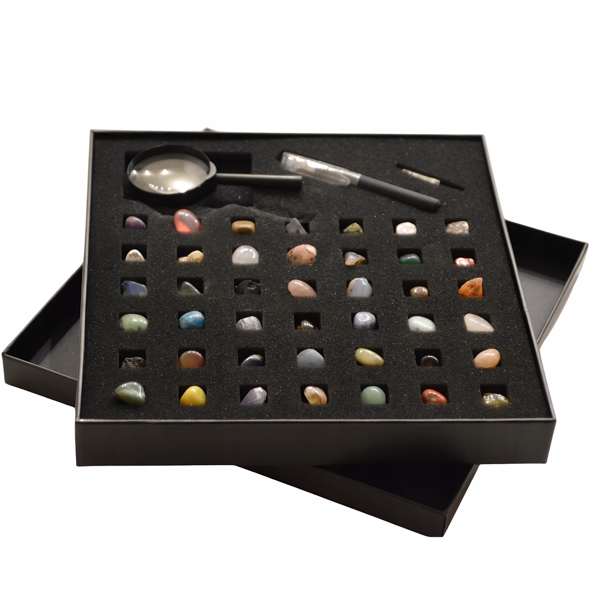 В елегантній коробці ви знайдете цілих 43 унікальних екземпляри - включаючи природні камені (необроблені та поліровані) і 4 синтетичні камені.