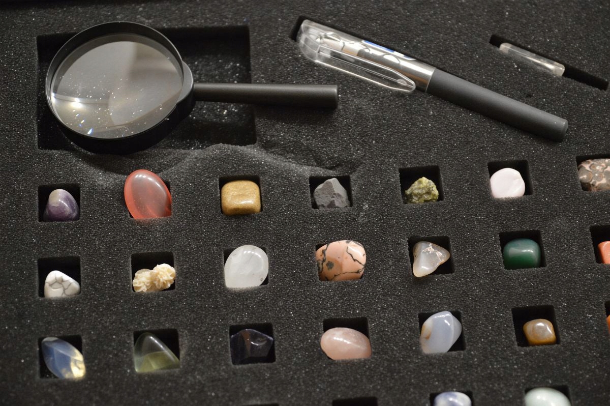 Набір включає, серед іншого: такі зразки, як: вулканічна лава (базальт), яшма (у різних сортах), сердолік, моховий агат, аметист, рожевий кварц, гірський кришталь (кварц), обсидіан, цитрин, содаліт, троянда пустелі та авантюрин. 💎
