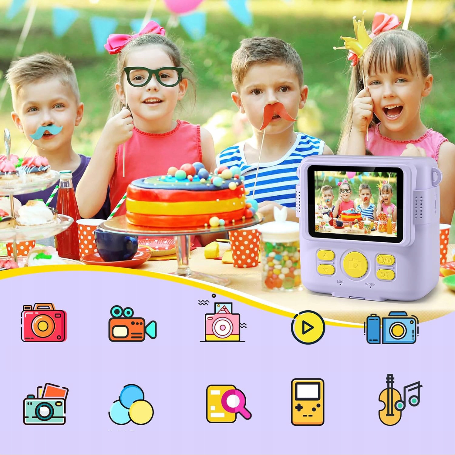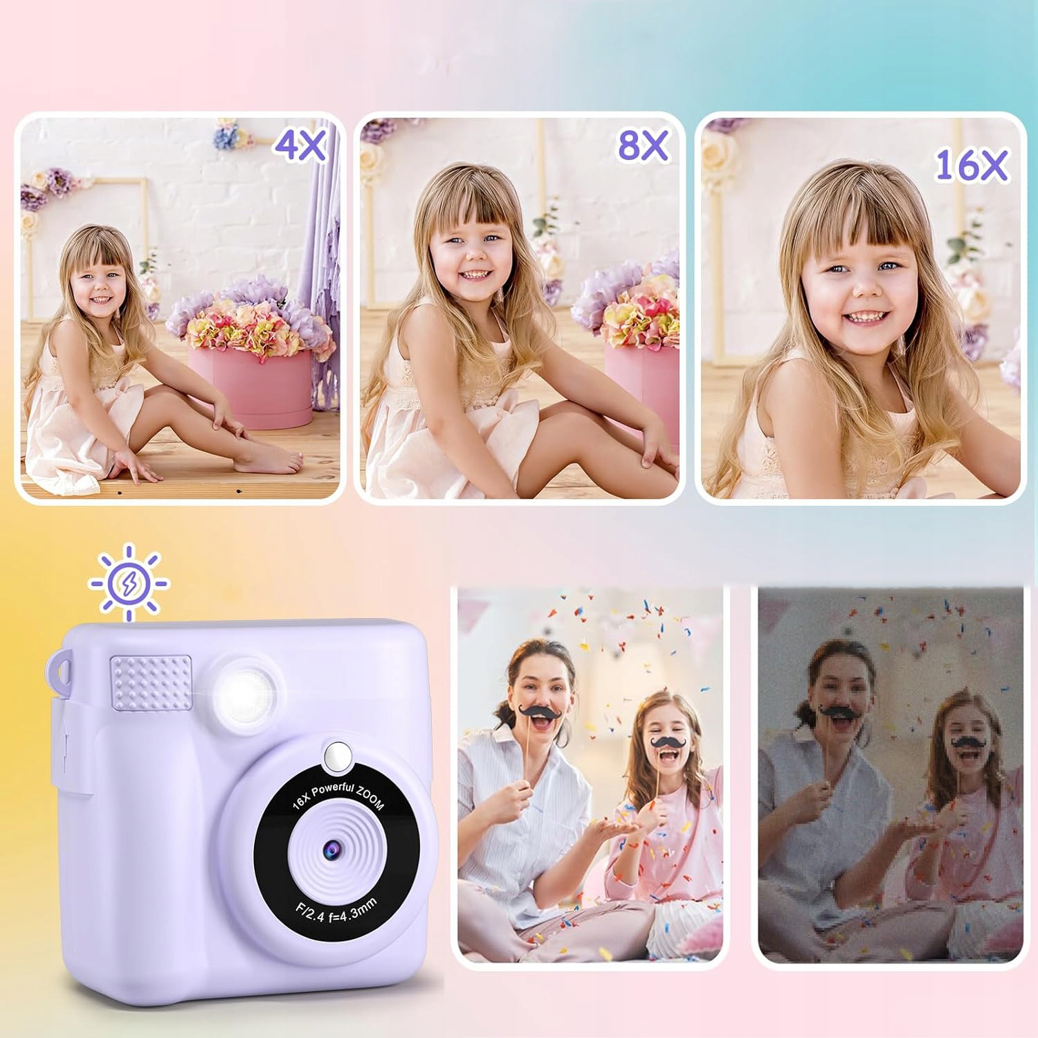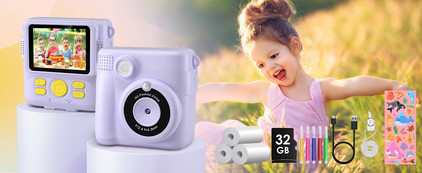 🟪 🟣 -Ремінь такого ж кольору допомагає дітям брати камеру куди завгодно. 6 різнокольорових ручок дозволяють дітям розгулятися уявою та творчими здібностями над друкованими чорно-білими фотографіями.