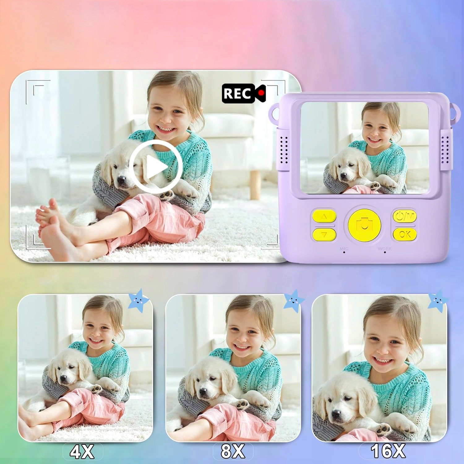 🟪 🟣- З 2,4-дюймовим IPS-екраном, який відображає яскраві кольори, і 16-кратним масштабуванням, що надає кілька варіантів зйомки, він також має безперервну зйомку, відтворення, музику, ігри та інші функції.