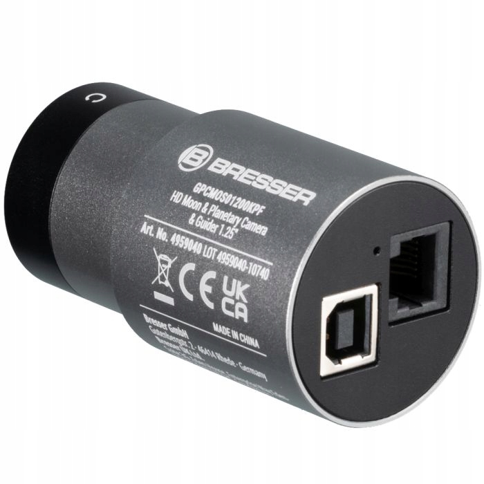 Камера BRESSER HD для фотографій Місяця і планет оснащена новим сенсором кольору SONY IMX225 CMOS з високою чутливістю, який навіть при використанні простого обладнання для спостереження за об'єктами неба дозволяє досягти дивовижних ефектів за дуже короткий час. час експозиції. Крім того, цю найсучаснішу камеру можна використовувати як автонавідник для активного відстеження основної камери, такої як SLR або CCD-камера. Універсальна кольорова камера CMOS забезпечує особливо чіткі зображення Місяця та планет.