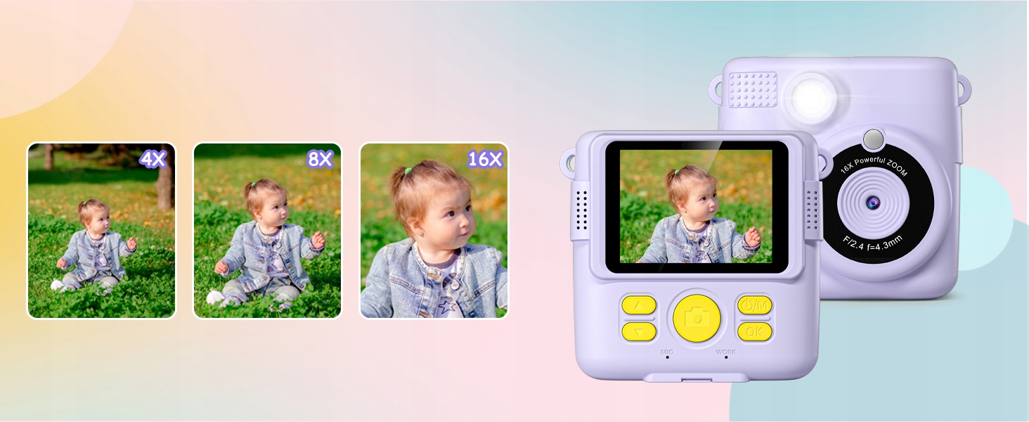 🟪🟣-Z 2,4-дюймовий екран IPS, який відображає яскраві кольори та 16-кратний масштаб, який забезпечує багато варіантів фотографії, також має безперервну фотографію, ігрову, музичну функції.