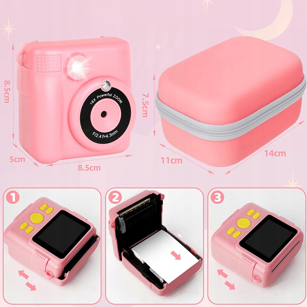 Камера оснащена відповідним повідцем для легкого перенесення та 6 барвистих ручок, завдяки якому діти можуть висловити свою творчість у друкованих фотографіях. Він також має інтелектуальний спалах та автоматичну експозицію чітких нічних фотографій.