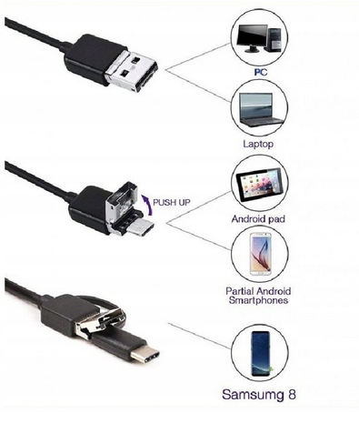 Водонепроникна оглядова камера USB/Micro USB/USB-C на м’якому кабелі 3,5 м + можливість фотографувати