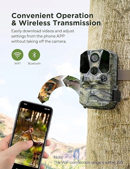 Зручна робота. Ця лісова камера, оснащена вбудованими функціями WiFi і Bluetooth, дозволяє переглядати та завантажувати фотографії та відео на свій телефон, не знімаючи лісової камери. Ви можете змінити налаштування та легко перевірити кут запису камери в додатку. Все, що вам потрібно зробити, це залишатися в радіусі дії сигналу WiFi камери (діапазон WiFi становить приблизно 32 фути).