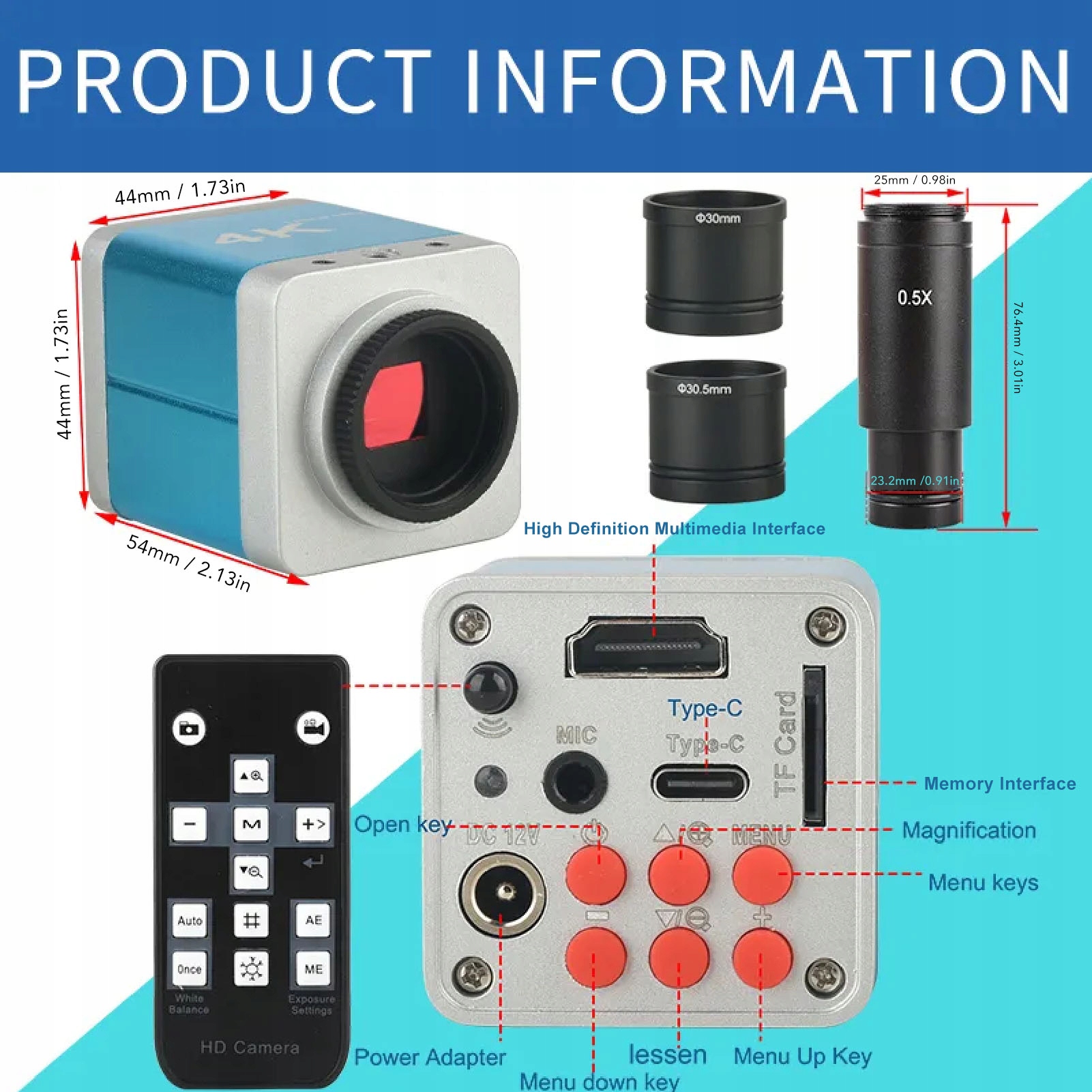 Як використовувати: 1. Ця промислова камера мікроскопа має мультимедійний інтерфейс високої роздільної здатності або вихід типу C, слідкуйте за дисплеєм безпосередньо за допомогою мультимедійного інтерфейсу високої роздільної здатності або використовуйте інтерфейс C -типу до комп'ютера.