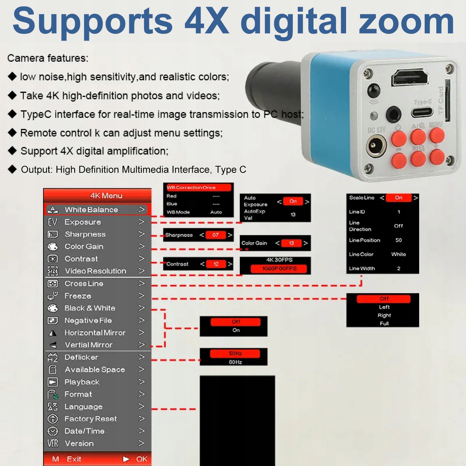 4. Введіть інтерфейс C: Цей мікроскоп промисловості 4K має інтерфейс C в режимі реального часу в режимі комп'ютера, а пульт дистанційного керування дозволяє налаштувати налаштування меню.
