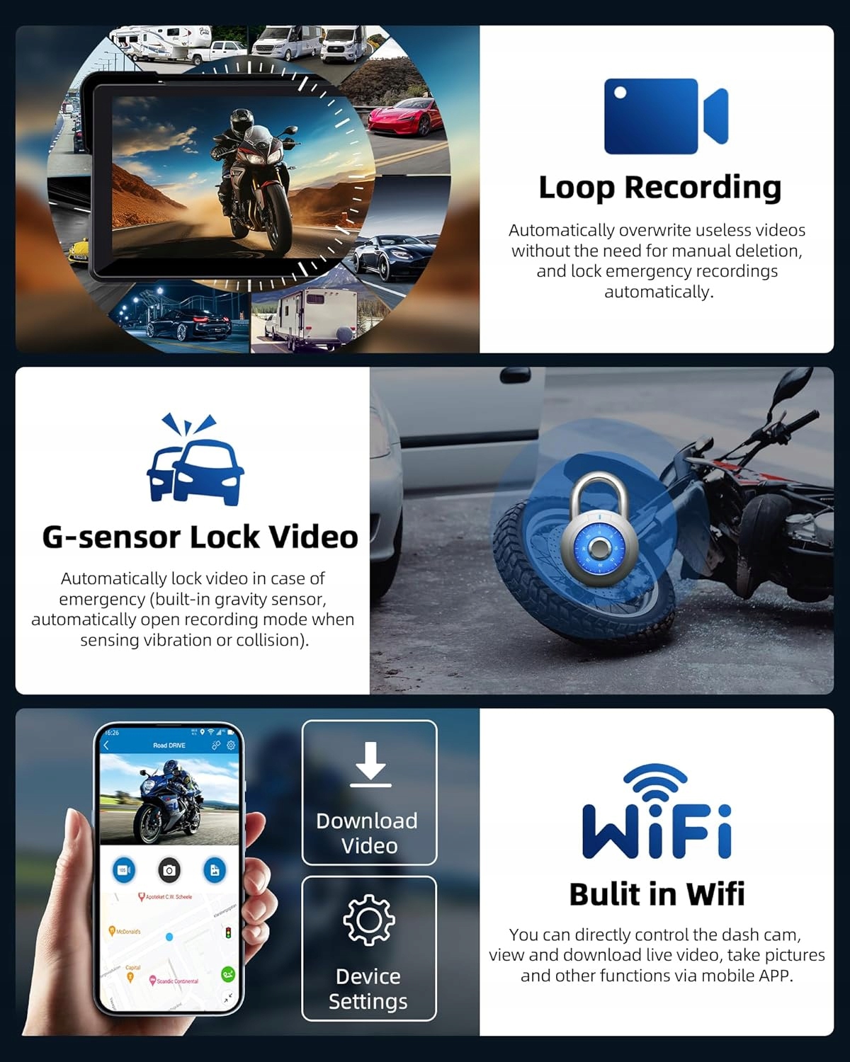 - 【Камера реєстратора з подвійною камерою 2K】Реєстратор оснащено двома камерами 2K HD і подвійними камерами, які записують одночасно, щоб знімати кришталево чисте відео для повного покриття. Він не лише записує сцену водіння спереду, але й відео ситуації водіння. Реєстратор оснащений функцією WiFi, яка дозволяє переглядати, відтворювати та завантажувати файли в режимі реального часу на ваш мобільний телефон. Реєстратор Carplay — найкращий подарунок для любителів мотоциклів!