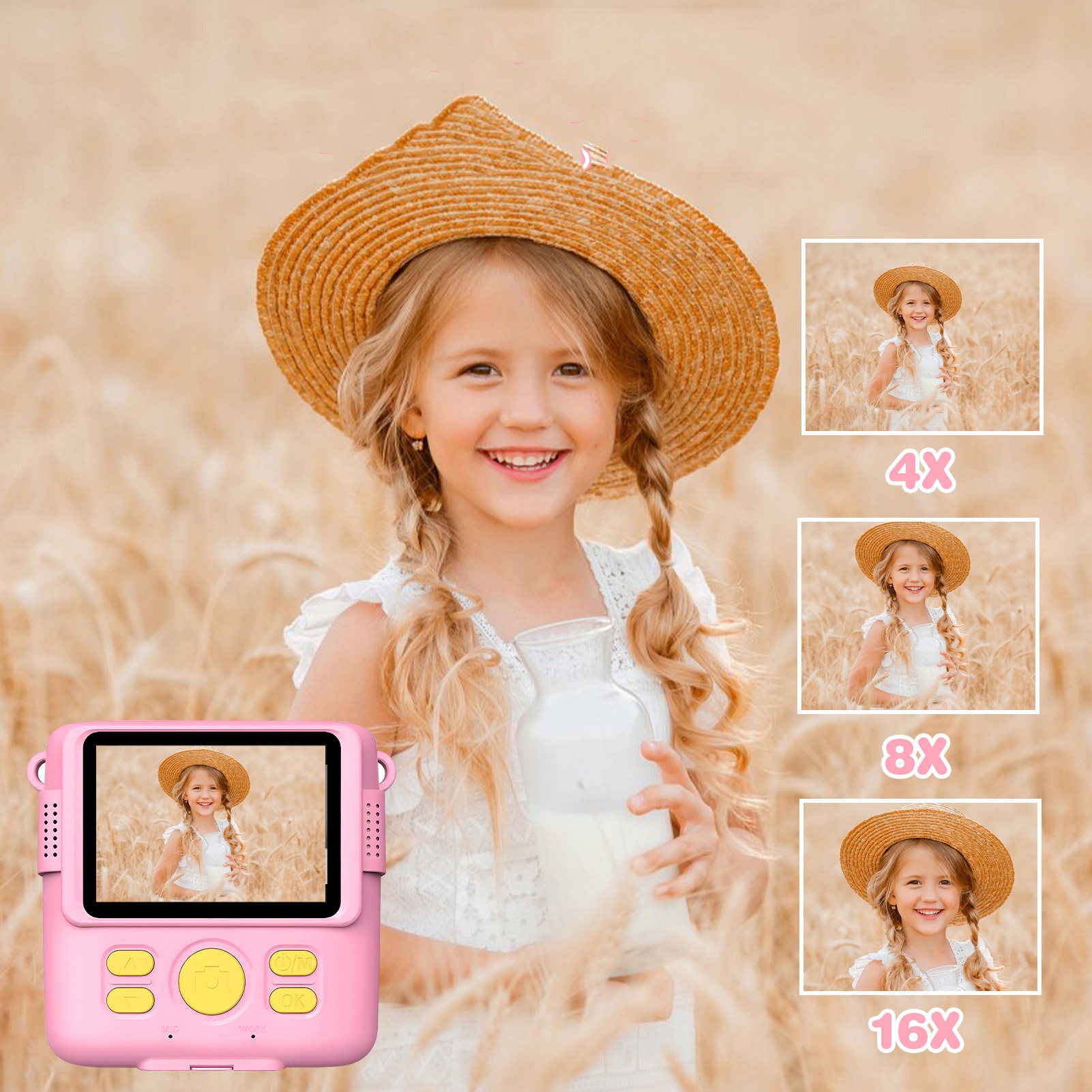 📷 Багатофункціональна цифрова камера для дітей - з миттєвим друком, великий екран 2,4 дюйма , відео 1080P, 16x цифрове збільшення, спалах, сповільнена зйомка, серійна зйомка, гра, кадр фільтра, MP3, аудіо- та відеозапис тощо; 4 ігри-головоломки, 18 вбудованих веселих фоторамок, 5 фільтрів і 8 спеціальних ефектів. Він відповідає різноманітним потребам дітей.