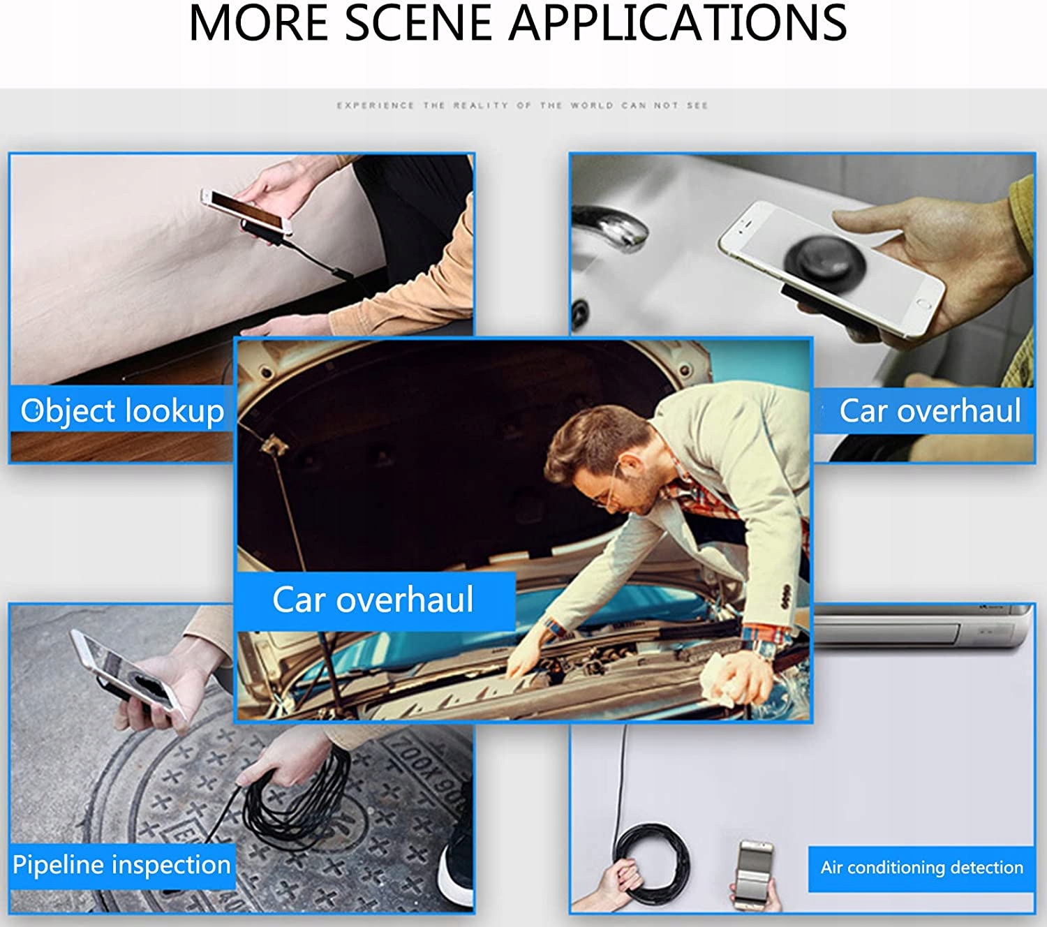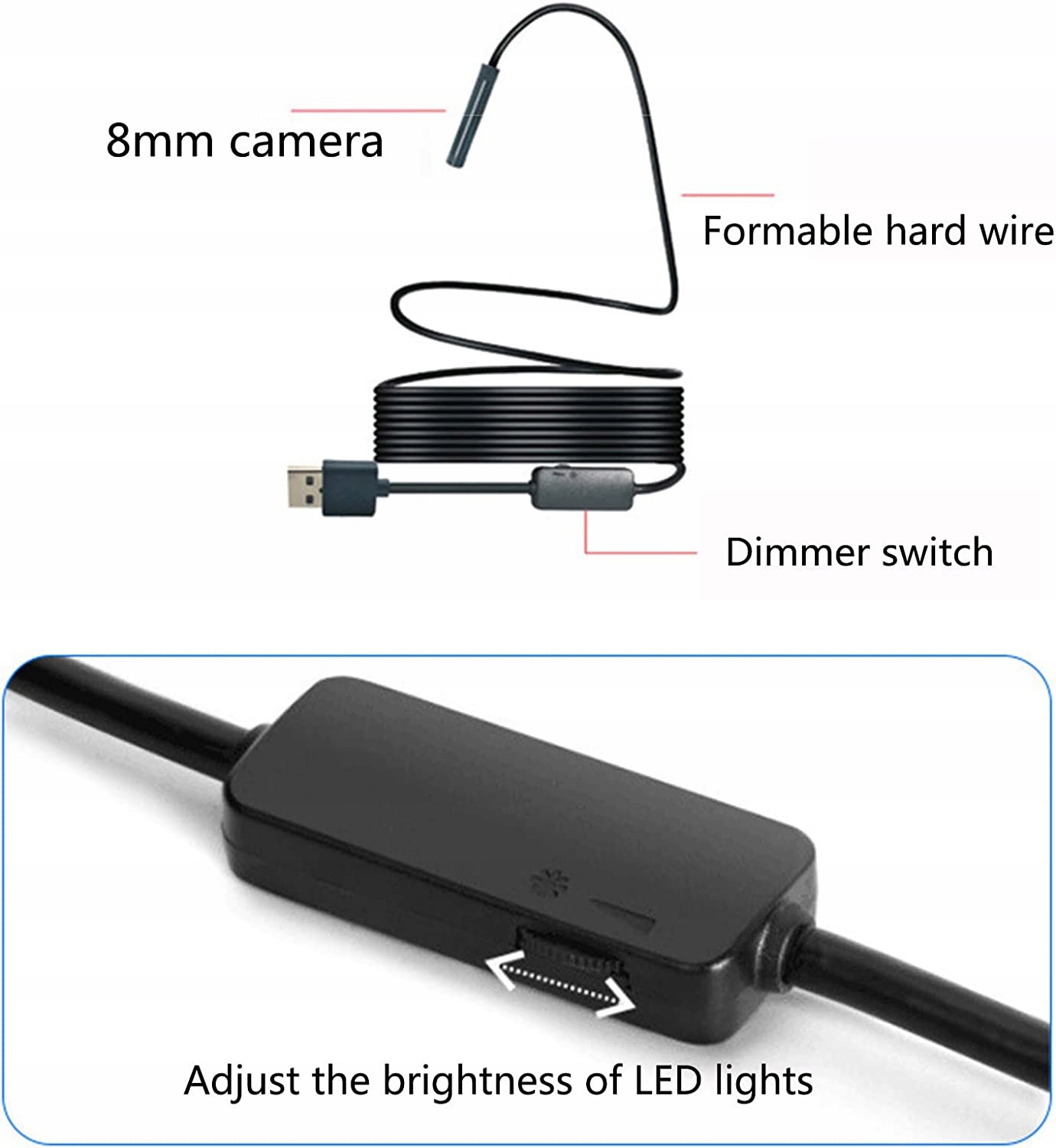 Роздільна здатність 1200P HD, оснащена мікросхемою USB-бороскопа 1200P HD COMS 2,0 МП, може надати вам чудовий досвід захоплення зображень і відео на iOSAndroidWindowsMac. Wift Connection Бездротову камеру ендоскопа можна легко підключити до вашого смартфона або планшета через WIFI після завантаження та встановлення сумісної програми на вашому пристрої, відсканувавши QR-код у посібнику. Порівняно з іншими ендоскопами для мобільних телефонів, оснащена 8 світлодіодами з регульованою яскравістю, водонепроникна камера IP67 може працювати в різних складних середовищах. Оглядова камера WIFI, що згинається, вирішила, що згинається напівтвердий міцний дріт 5M з ультразвуковим регулятором зварювання є кращим, ніж інші м’які. Може згинатися та зберігати форму, щоб отримати доступ до вузьких місць, таких як вигнуті отвори або труби. 8-міліметровий бездротовий ендоскоп Wi-Fi-лінза ендоскопа з регульованою яскравістю для легкого доступу до вузьких і темних місць для неруйнівного контролю, наприклад для технічного обслуговування автомобіля, виявлення ланцюга в стіні, ремонту дренажної труби та побутової техніки.