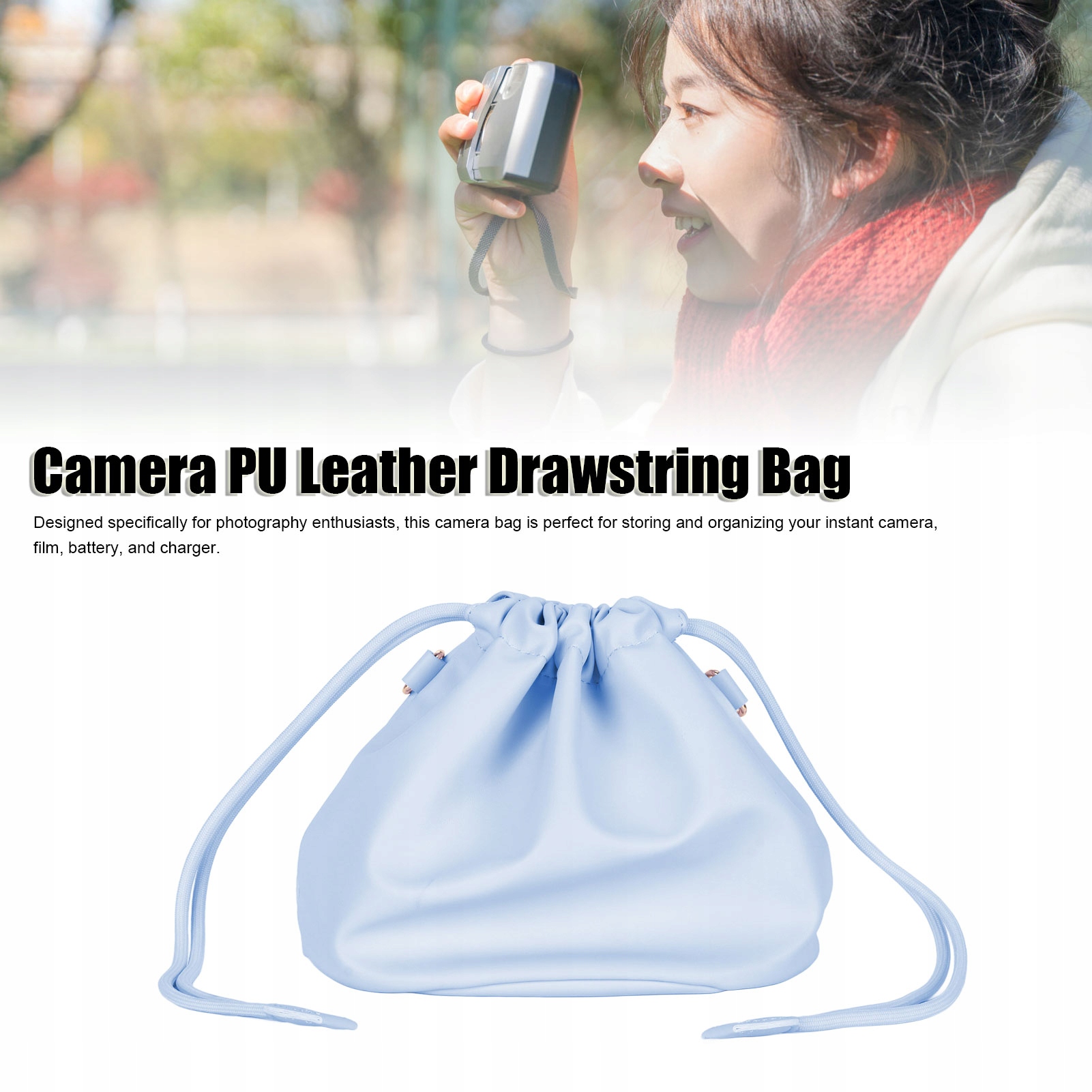 - 2 мішки струнної камери - це міцна і водонепроникна сумка з камерою з вовняною підкладкою посередині для захисту миттєвої камери та аксесуарів.
