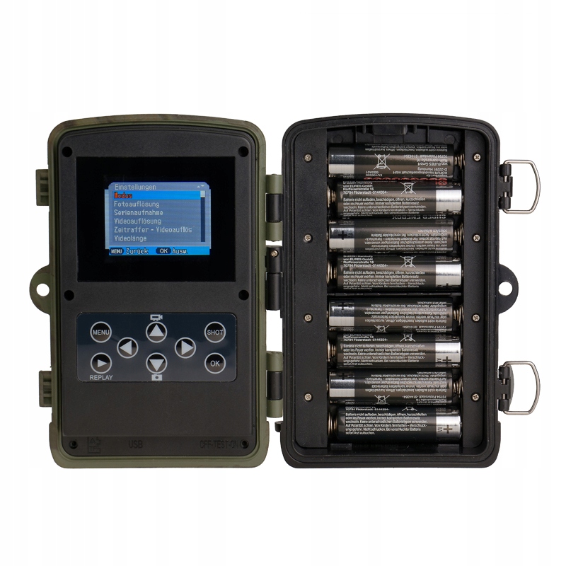 Знімайте камерою з 5 МП CMOS і об’єктивом 90°. Запис 1-10 фотографій до 24 Мп або 3 с-10 хв відео до 2,7 К/20 кадрів/с, 3xPIR 120° сенсор/відповідь 0,5 с/36 чорних ІЧ-світлодіодів до 20 м, внутрішній 2-дюймовий РК-дисплей, microSD до 256 ГБ, 4x або 8x батарея AA, розміри 135x90x76 мм, вага 314 г, водонепроникне меню CZ згідно IP65, кольорові знімки вдень і чорно-білі вночі, запис дати, часу, температури і фази місяця, PIR-датчик має 3 чутливості, інтервал між знімками. 5 с-60 хв, сповільнена зйомка 3 с-24 год, режим очікування 0,2 мА до 6 місяців, мікрофон, пароль 4 цифри, microUSB, постійний струм 6 В/1,5 А (3,5 мм/1,35 мм роз’єм живлення) для Зовнішнє джерело живлення, різьба для штатива, камуфляжний дизайн, поставляється з USB-кабелем і кріпильним ременем. Задня пластикова підставка для кріплення зі світлодіодним ременем BlackVision не видно, навіть якщо дивитися прямо на камеру.